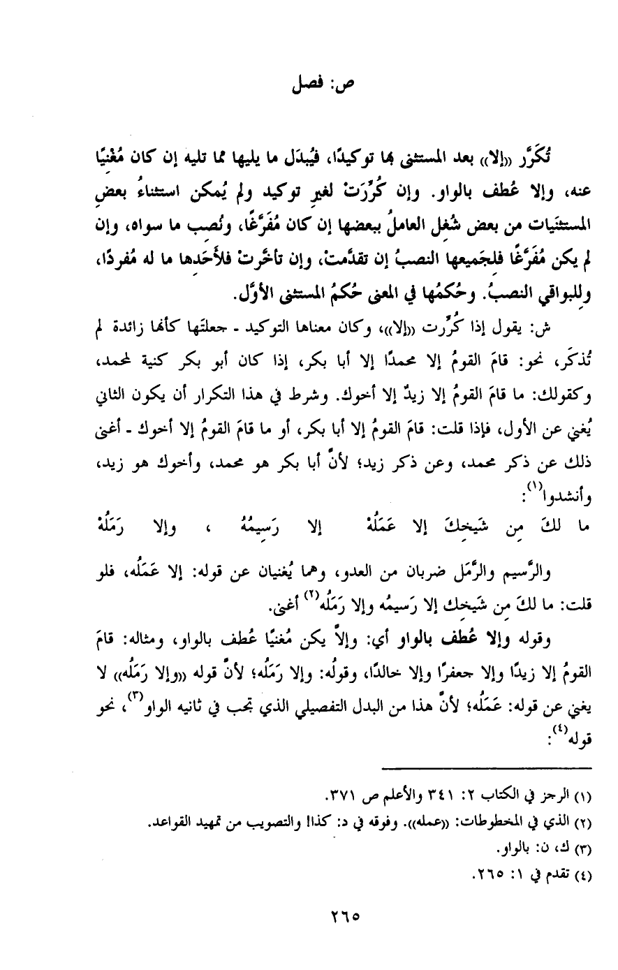 ش: يقول إذا كررت "إلا", وكان معناها التوكيد - جعلتها كأنها زائدة لم تذكر, نحو: قام القوم إلا محمدًا إلا أبا بكر, إذا كان أبو بكر كنية لمحمد, وكقولك: ما قام القوم إلا زيد إلا أخوك, وشرط في هذا التكرار أن يكون الثاني يغني عن الأول, فإذا قلت: قام القوم إلا أبا بكر, أو ما قام القوم إلا أخوك - أغنى ذلك عن ذكر محمد, وعن ذكر زيد؛ لأن أبا بكر هو محمد, وأخوك هو زيد, وأنشدوا: