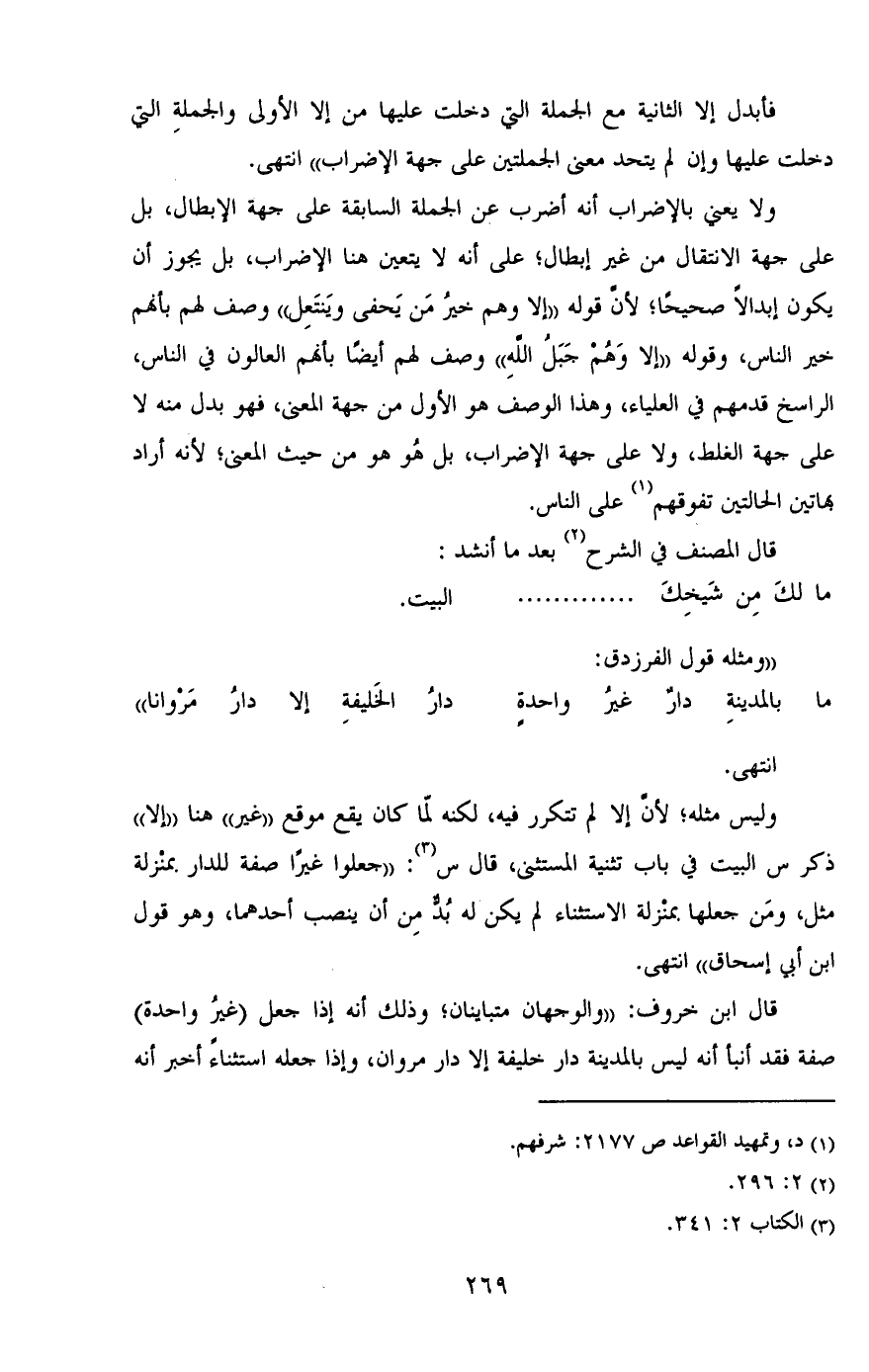 ولا يعني بالإضراب أنه أضرب عن الجملة السابقة على جهة الإبطال, بل على جهة الانتقال من غير إبطال؛ على أنه لا يتعين هنا الإضراب, بل يجوز أن يكون إبدالًا صحيحًا؛ لأن قوله "إلا وهم خير من يحفى وينتعل" وصف لهم بأنهم خير الناس, وقوله "إلا وهم جبل الله" وصف لهم أيضًا بأنهم العالون في الناس, الراسخ قدمهم في العلياء, وهذا الوصف هو الأول من جهة المعنى, فهو بدل منه لا على جهة الغلط, ولا على جهة الإضراب, بل هُو هو من حيث المعنى؛ لأنه أراد بهاتين الحالتين تفوقهم على الناس.