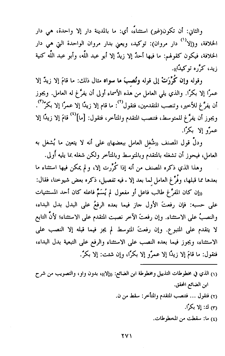 وقوله إن كررت إلى قوله ونصب ما سواه مثال ذلك: ما قام إلا زيد إلا عمرًا إلا بكرًا, والذي يلي العامل من هذه الأسماء أولى أن يفرغ له العامل, ويجوز أن يفرغ للأخير, وتنصب المتقدمين, فتقول: ما قام إلا زيدًا إلا عمرًا إلا بكر, ويجوز أن يفرغ للمتوسط, فتنصب المتقدم والمتأخر, فتقول:] ما [قام إلا زيدًا إلا عمرو إلا بكرًا.