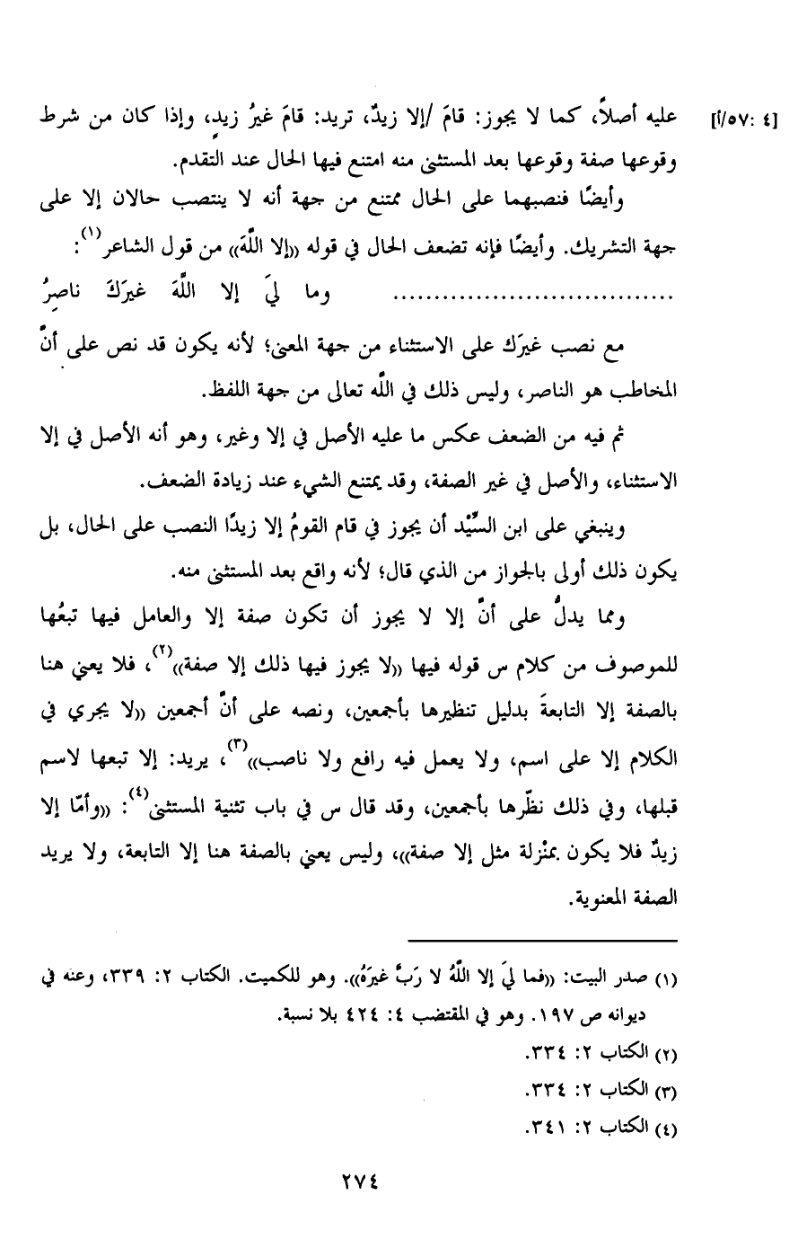 ومما يدل على أن إلا لا يجوز أن تكون صفة إلا والعامل فيها تبعها للموصوف من كلام س قوله فيها "لا يجوز فيها ذلك إلا صفة"، فلا يعني هنا بالصفة إلا التابعة بدليل تنظيرها بأجمعين, ونصه على أن أجمعين "لا يجري في الكلام إلا على اسم, ولا يعمل فيه رافع ولا ناصب"، يريد: إلا تبعها لاسم قبلها, وفي ذلك نظرها بأجمعين, وقد قال س في باب تثنية المستثنى: "وأما إلا زيد فلا يكون بمنزلة مثل إلا صفة"، وليس يعني بالصفة هنا إلا التابعة, ولا يريد الصفة المعنوية.