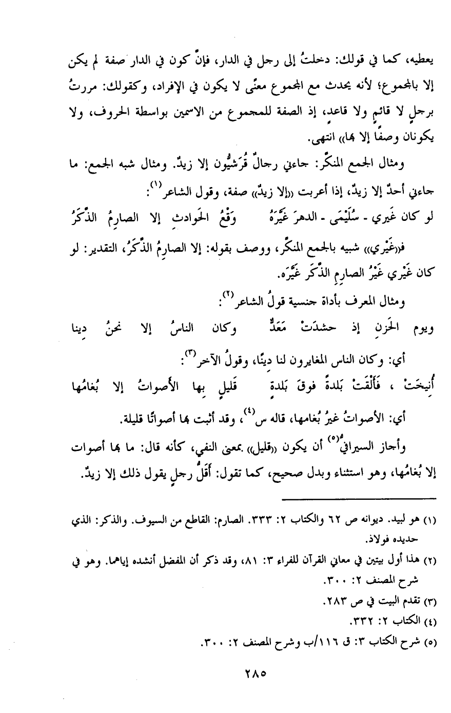 ومثال الجمع المنكر: جاءني رجال قرشيون إلا زيد, ومثال شبه الجمع: ما جاءني أحد إلا زيد, إذا أعربت "إلا زيد" صفة, إذا أعربت "إلا زيد" صفة, وقول الشاعر: