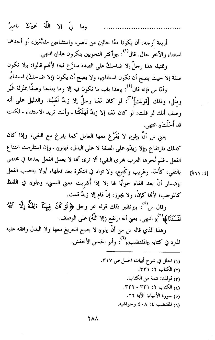 وقال س: "ونظير ذلك قوله عز وجل {لَوْ كَانَ فِيهِمَا آلِهَةٌ إِلَّا اللَّهُ لَفَسَدَتَا} انتهى, يعني أنه ارتفع (إلا الله) على الوصف.