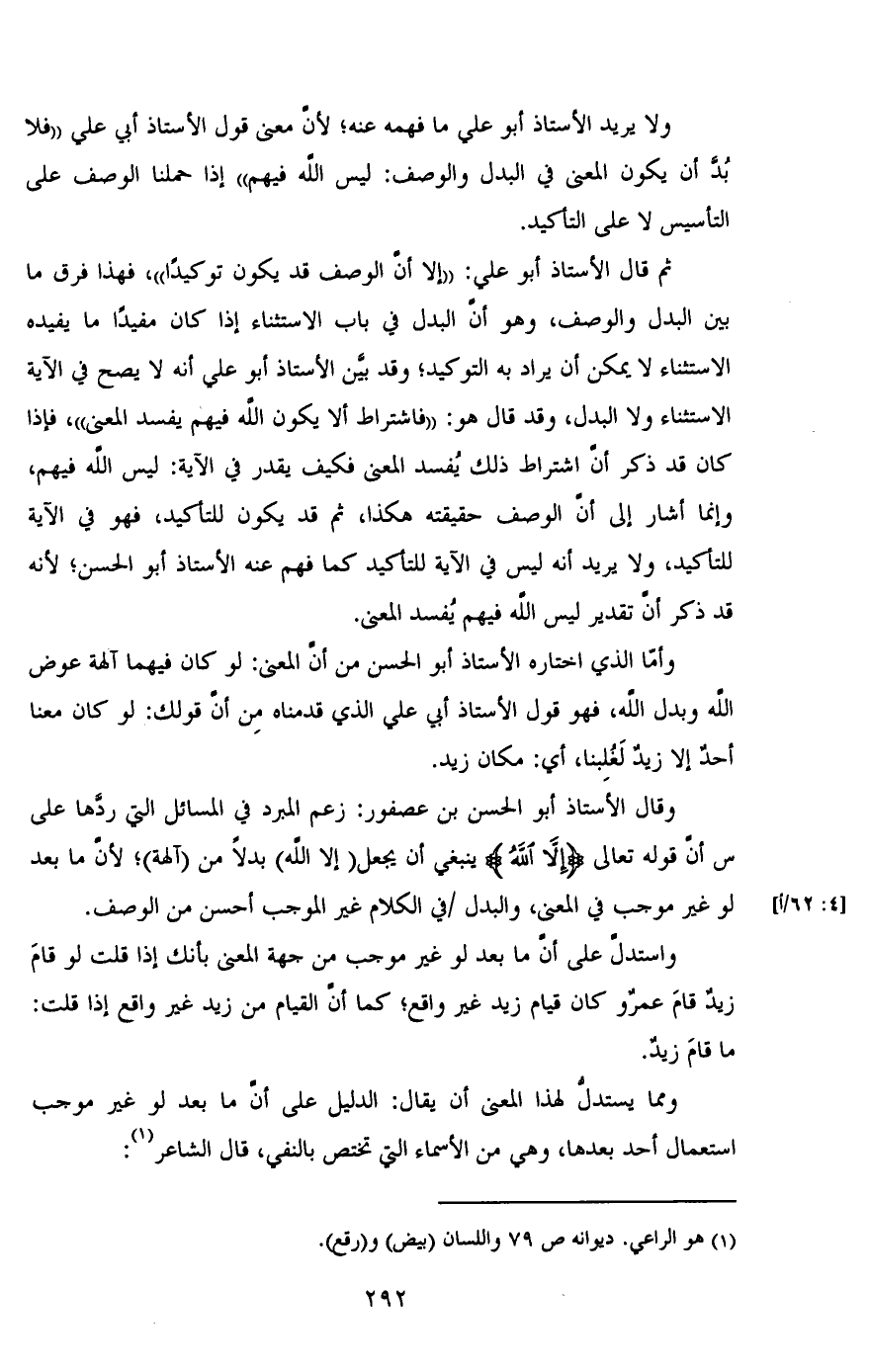 ولا يريد الأستاذ أبو علي ما فهمه عنه؛ لأن معنى قول الأستاذ أبي علي "فلا بد أن يكون المعنى في البدل والوصف: ليس الله فيهم" إذا حملنا الوصف على التأسيس لا على التأكيد.