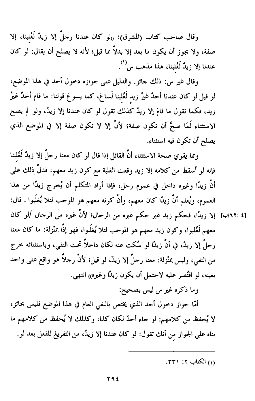وقال صاحب كتاب "المشرق": "لو كان عندنا رجل إلا زيد لغلبنا، إلا صفة، ولا يجوز أن يكون ما بعد إلا بدلًا مما قبل؛ لأنه لا يصلح أن يقال: لو كان عندنا إلا زيد لغلبنا، هذا مذهب س.