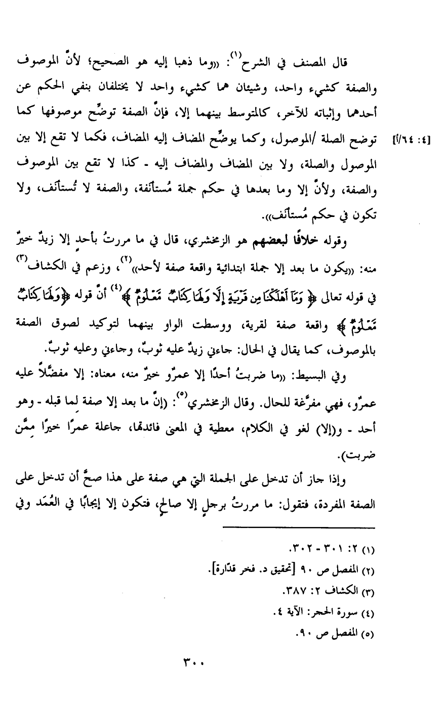 وقوله خلافًا لبعضهم هو الزمخشري، قال في ما مررت بأحد إلا زيد خير منه: "يكون ما بعد إلا جملة ابتدائية واقعة صفة لأحد"، وزعم في الكشاف في قوله تعالى {ومَا أَهْلَكْنَا مِن قَرْيَةٍ إلاَّ ولَهَا كِتَابٌ مَّعْلُومٌ} أن قوله {ولَهَا كِتَابٌ مَّعْلُومٌ} واقعة صفة لقرية، ووسطت الواو بينهما لتوكيد لصوق الصفة بالموصوف، كما يقال في الحال: جاءني زيد عليه ثوب، وجاءني وعليه ثوب.
