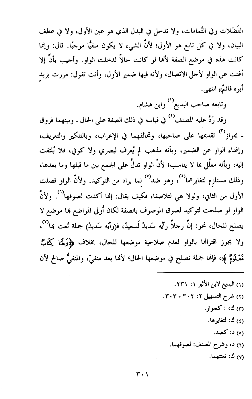 وقد رد عليه المصنف في قياسه في ذلك الصفة على الحال - وبينهما فروق- بجواز تقديمها على صاحبها، وتخالفها في الإعراب، وبالتنكير والتعريف، وإغناء الواو عن الضمير، وبأنه مذهب لم يعرف لبصري ولا كوفي، فلا يلتفت إليه، وبأنه معلل بما لا يناسب؛ لأن الواو تدل على الجمع بين ما قبلها وما بعدها، وذلك مستلزم لتغايرهما، وهو ضد لما يراد من التوكيد. ولأن الواو فصلت الأول من الثاني، ولولا هي لتلاصقا، فكيف يقال: إنها أكدت لصوقها. ولأن الواو لو صلحت لتوكيد لصوق الموصوف بالصفة لكان أولى المواضع بها موضع لا يصلح للحال، نحو: إن رجلا رأيه سديد لسعيد، فـ (رأيه سديد) جملة نعت بها، ولا يجوز اقترانها بالواو لعدم صلاحية موضعها للحال، بخلاف {ولَهَا كِتَابٌ مَّعْلُومٌ}، فإنها جملة تصلح في موضعها الحال؛ لأنها بعد منفي، والمنفي صالح لأن