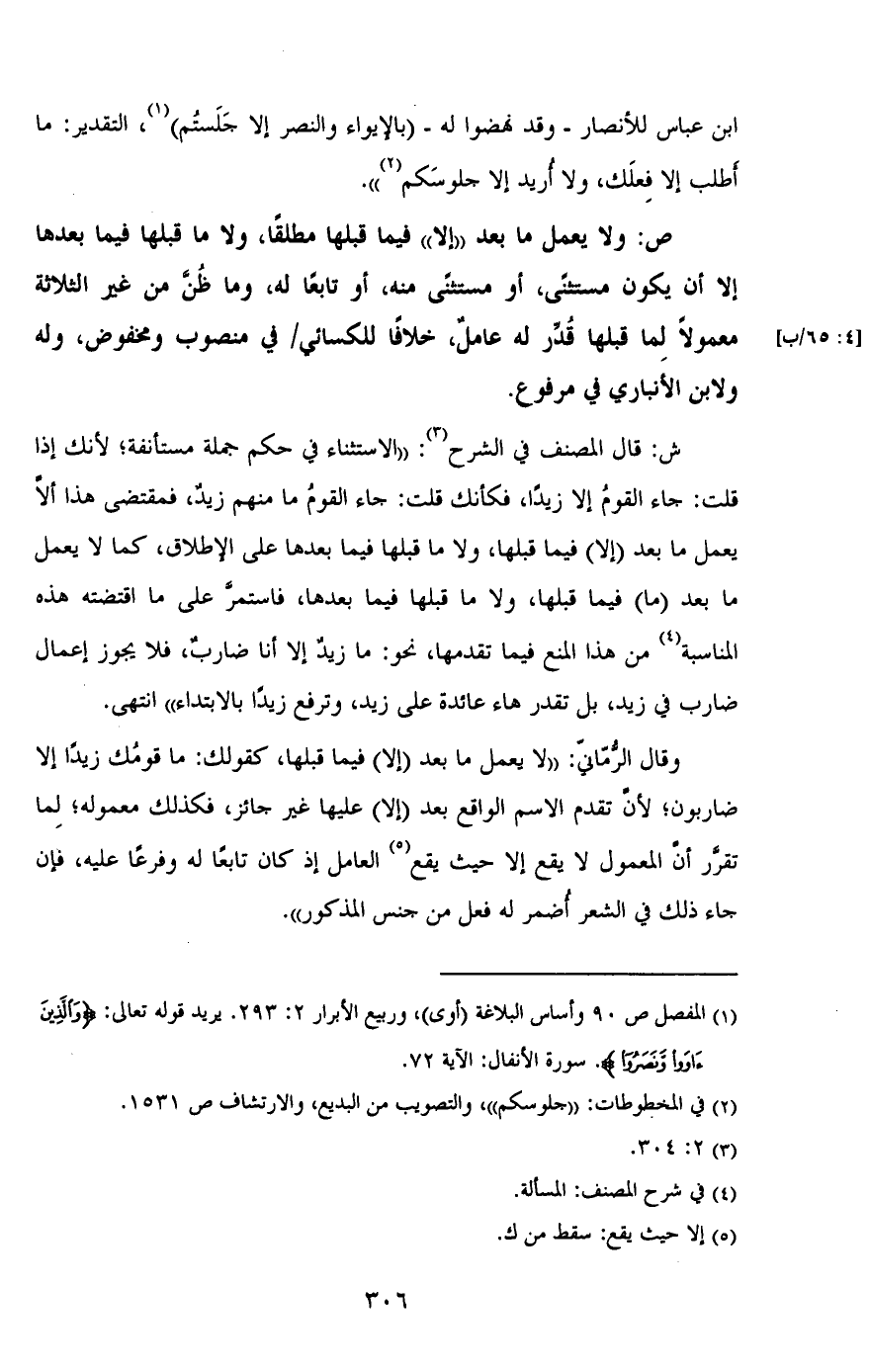 ش: قال المصنف في الشرح: "الاستثناء في حكم جملة مستأنفة؛ لأنك إذا قلت: جاء القوم إلا زيدًا، فكأنك قلت: جاء القوم ما منهم زيد، فمقتضى هذا ألا يعمل ما بعد (إلا) فيما قبلها، ولا ما قبلها فيما بعدها على الإطلاق، كما لا يعمل ما بعد (ما) فيما قبلها، ولا ما قبلها فيما بعدها، فاستمر على ما اقتضته هذه المناسبة من هذا المنع فيما تقدمها، نحو: ما زيد إلا أنا ضارب، فلا يجوز إعمال ضارب في زيد، بل تقدر هاء عائدة على زيد، وترفع زيدًا بالابتداء" انتهى.