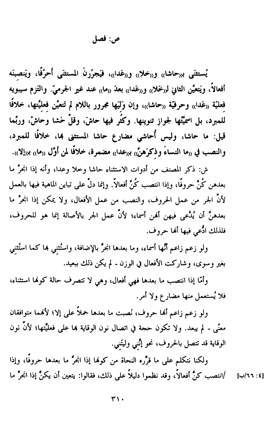 يُستثنى بـ"حاشا" و"خلا" و"عدا"، فيجررن المستثنى أحرفًا، وينصبه أفعالًا، ويتعين الثاني لـ"خلا" و "عدا" بعد "ما" عند غير الجرمي. والتزم سيبويه فعلية "عدا" وحرفية "حاشا"، وإن وليها مجرور باللام لم تتعين فعليتها، خلافًا للمبرد بل أسميتها لجواز تنوينها. وكثر فيها حاش، وقل حشا وحاش، وربما قيل: ما حاشا، وليس أُحاشي مضارع حاشا المستثنى بها، خلافًا للمبرد، والنصب في "ما النساء وذكرهن" بـ"عدا" مضمرة، خلافًا لمن أول "ما" بـ"إلا".]-