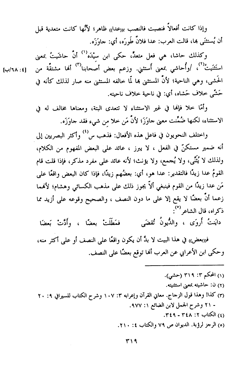 وكذلك حاشا، هي فعل متعد، حكي ابن سيده أن حاشيت بمعنى استثنيت، / [4: 68/ ب] وأُحاشي بمعنى أستثني. وزعم بعض أصحابنا أنها مشتقة من الحشي، وهي الناحية؛ لأن المستثنى بها لما خالفه المستثنى منه صار لذلك كأنه في حشي خلاف حشاه، أي: في ناحية خلاف ناحيته.