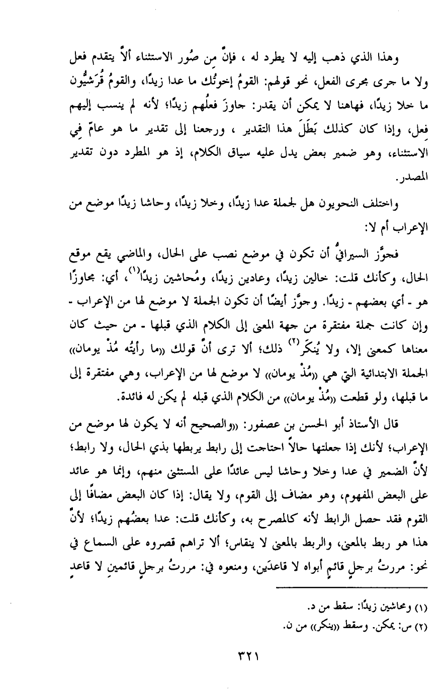 فجوز السيرافي أن تكون في موضع نصب على الحال، والماضي يقع موقع الحال، وكأنك قلت: خالين زيدًا، وعادين زيدًا، ومُحاشين زيدًا، أي: مجاوزًا هو - أي بعضهم - زيدًا. وجوز أيضًا أن تكون الجملة لا موضع لها من الإعراب وإن كانت جملة مفتقرة من جهة المعنى إلى الكلام الذي قبلها - من حيث كان معناها كمعنى إلا، ولا يُنكر ذلك؛ ألا ترى أن قولك "ما رأيته مُذ يومان" الجملة الابتدائية التي هي "مُذ يومان" لا موضع لها من الإعراب، وهي مفتقرة إلى ما قبلها، ولو قطعت "مُذ يومان" من الكلام الذي قبله لم يكن له فائدة.