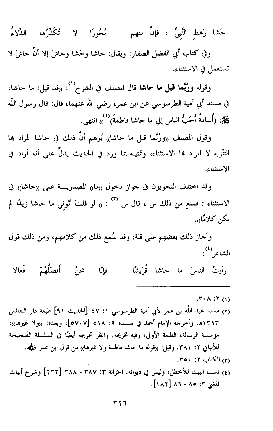 وقوله وربما قيل ما حاشا قال المصنف في الشرح: "قد قيل: ما حاشا، في مسند أبي أمية الطرسوسي عن ابن عمر، رضي الله عنهما، قال: قال رسول الله صلى الله عليه وسلم: (أسامة أحب الناس إلى ما حاشا فاطمة) " انتهى.
