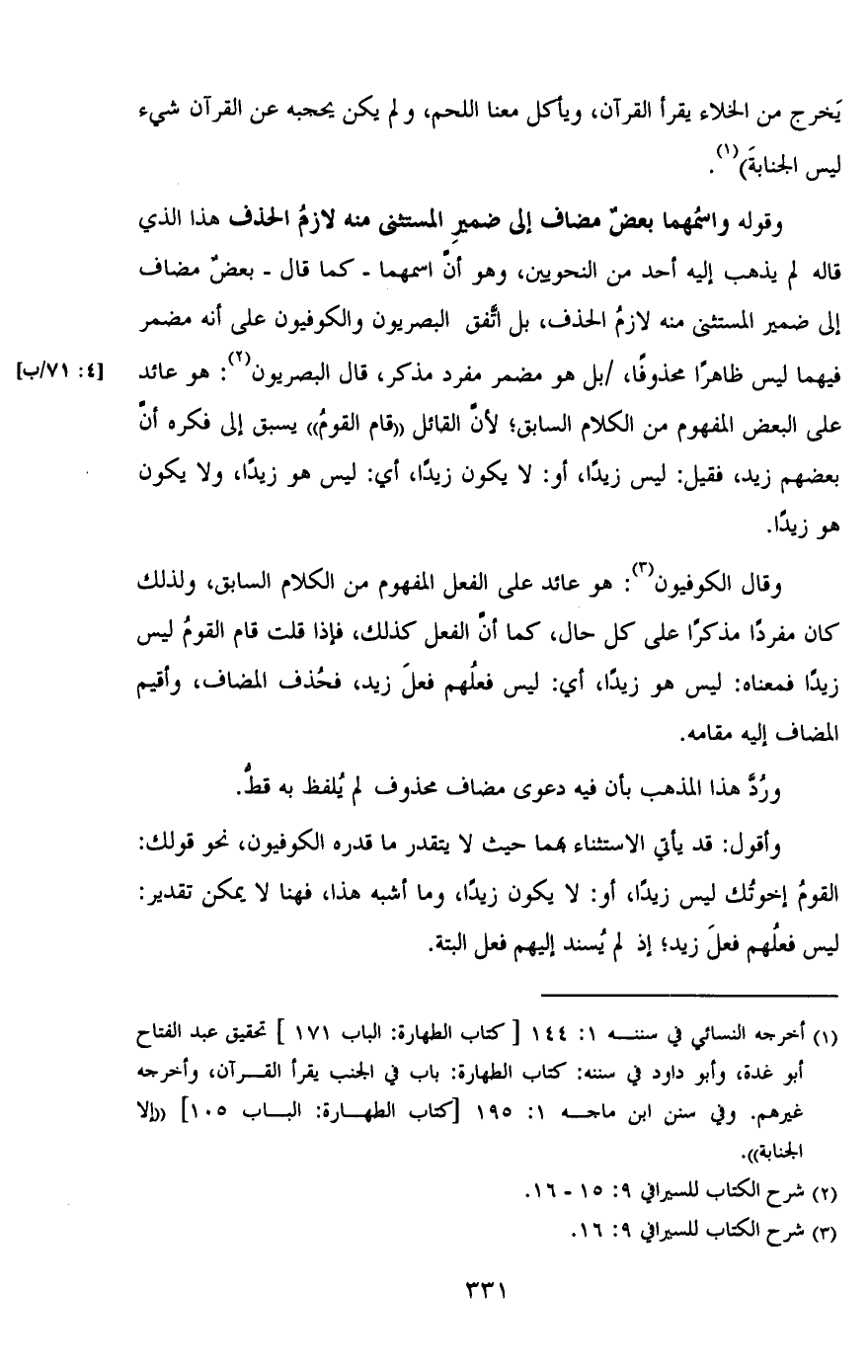 وقول واسمهما بعض مضاف إلى ضمير المستثنى منه لازم الخذف هذا الذي قاله لم يذهب إليه أحد من النحويين، وهو أن اسمها- كما قال - بعض مضاف إلى ضمير المستثنى منه لازم الحذف، بل اتفق البصريون والكوفيون على أنه مضمر فيهما ليس ظاهرًا محذوفًا،/ [71:4/ب] بل هو مضمر مفرد مذكر، قال البصريون: هو عائد على البعض المفهوم من الكلام السابق؛ لأن القائل ((قام القوم)) يسبق إلى فكرة أن بعضهم زيد، فقيل: ليس زيدًا، أو: لا يكون زيدًا، أي: ليس هو زيدًا ولا تكون هو زيدًا.
