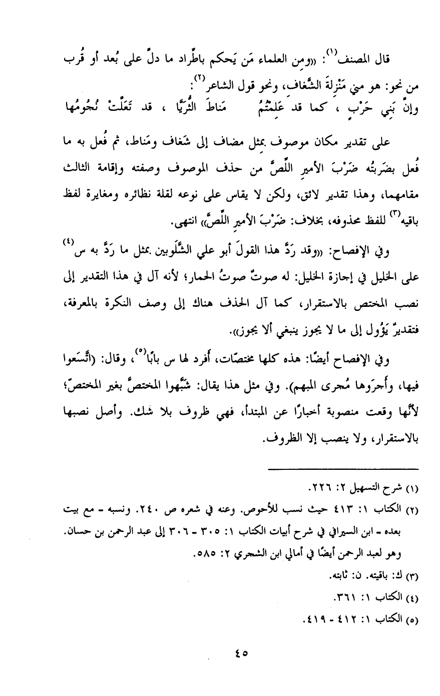وفي الإفصاح: "وقد رد هذا القول أبو علي الشلوبين بمثل ما رد به س على الخليل في إجازة الخليل: له صوتٌ صوت الحمار؛ لأنه آل في هذا التقدير إلى نصب المختص بالاستقرار، كما آل الحذف هناك إلى وصف النكرة بالمعرفة، فتقديرٌ يؤول إلى ما لا يجوز ينبغي ألا يجوز".