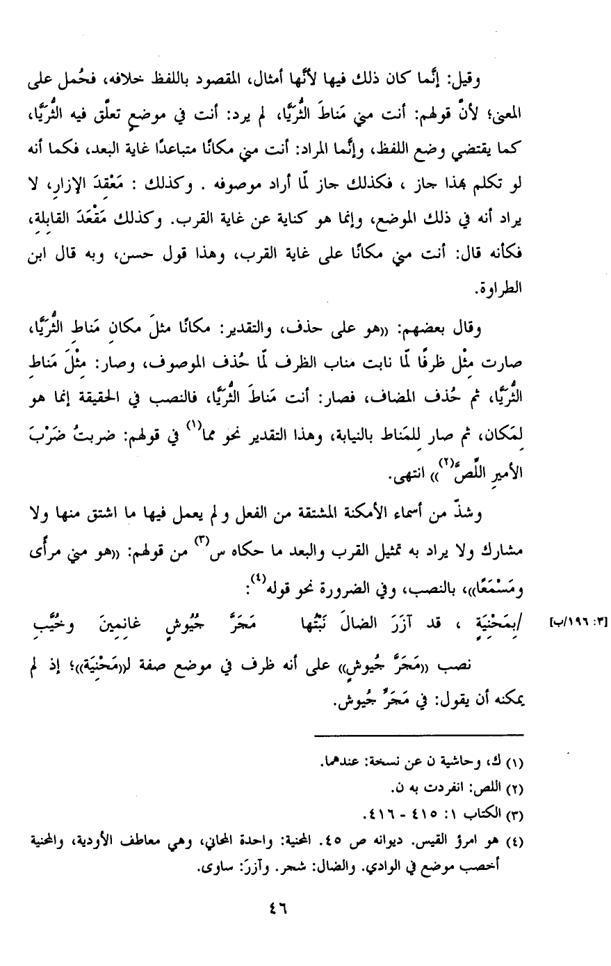 وقيل: إنما كان ذلك فيها لأنها أمثال، المقصود باللفظ خلافه، فحمل على المعنى؛ لأن قولهم: أنت مني مناط الثريا، لم يرد: أنت في موضعٍ تعلق فيه الثريا، كما يقتضي وضع اللفظ، وإنما المراد: أنت مني مكانًا متباعدًا غاية البعد، فكما أنه لو تكلم بهذا جاز، فكذلك جاز لما أراد موصوفه. وكذلك: معقد الإزار، لا يراد أنه في ذلك الموضع، وإنما هو كناية عن غاية القرب. وكذلك مقعد القابلة، فكأنه قال: أن مني مكانًا على غاية القرب، وهذا قول حسن، وبه قال ابن الطراوة.