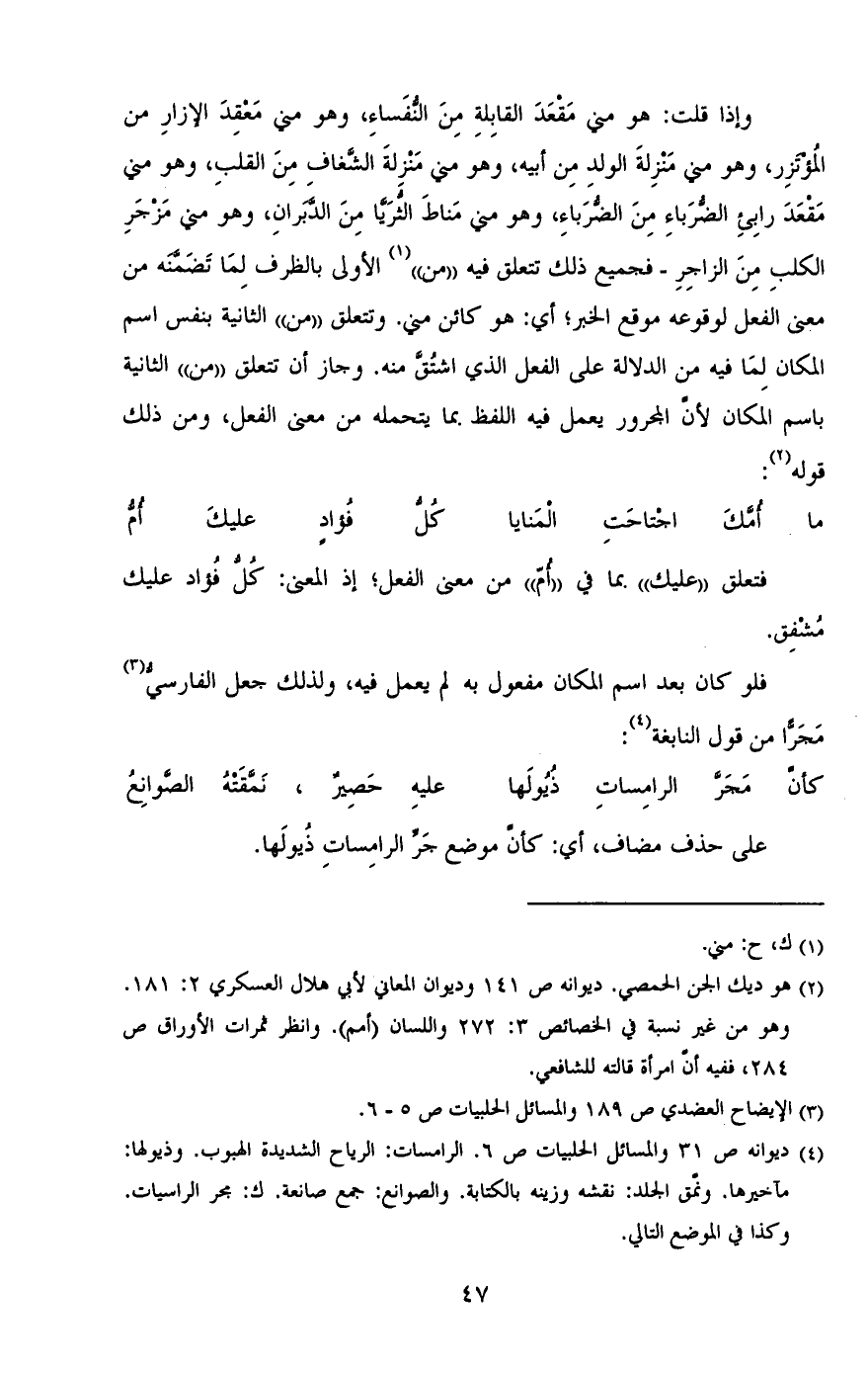 وإذا قلت: هو مني مقعد القابلة من النفساء، وهو مني معقد الإزار من المؤتزر، وهو مني منزلة الولد من أبيه، وهو مني منزلة الشغاف من القلب، وهو مني مقعد رابئ الضرباء من الضرباء، وهو مني مناط الثريا من الدبران، وهو مني مزجر الكلب من الزاجر - فجميع ذلك تتعلق فيه "من" الأولى بالظرف لما تضمنه من معنى الفعل لوقوعه موقع الخبر؛ أي: هو كائن مني. وتتعلق "من" الثانية بنفس اسم المكان لما فيه من الدلالة على الفعل الذي اشتق منه. وجاز أن تتعلق "من" الثانية باسم المكان لأن المجرور يعمل فيه اللفظ بما يتحمله من معنى الفعل، ومن ذلك قوله: