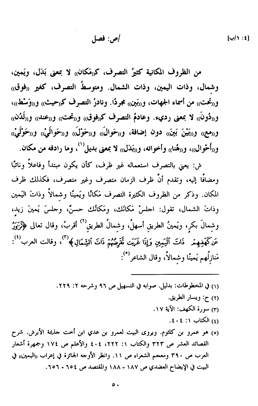 ش: يعني بالترف استعماله غير ظرف، كأن يكون مبتدأ وفاعلًا ونائبًا ومضافًا إلي، وتقدم أن ظرف الزمان متصرف وغير متصرف، فكذلك ظرف المكان. وذكر من الظروف الكثيرة التصرف مكانًا ويمينًا وشمالًا وذات اليمين وذات الشمال، تقول: اجلس مكانك، ومكانك حسنٌ، جلس يمين زيدٍ، وشمال بكرٍ، ويمين الطريق أسهل، وشمال الطريق أقرب، وقال تعالى {تَّزَاوَرُ عَن كَهْفِهِمْ ذَاتَ اليَمِينِ وإذَا غَرَبَت تَّقْرِضُهُمْ ذَاتَ الشِّمَالِ}، وقالت العرب: منازلهم يمينًا وشمالًا، وقال الشاعر: