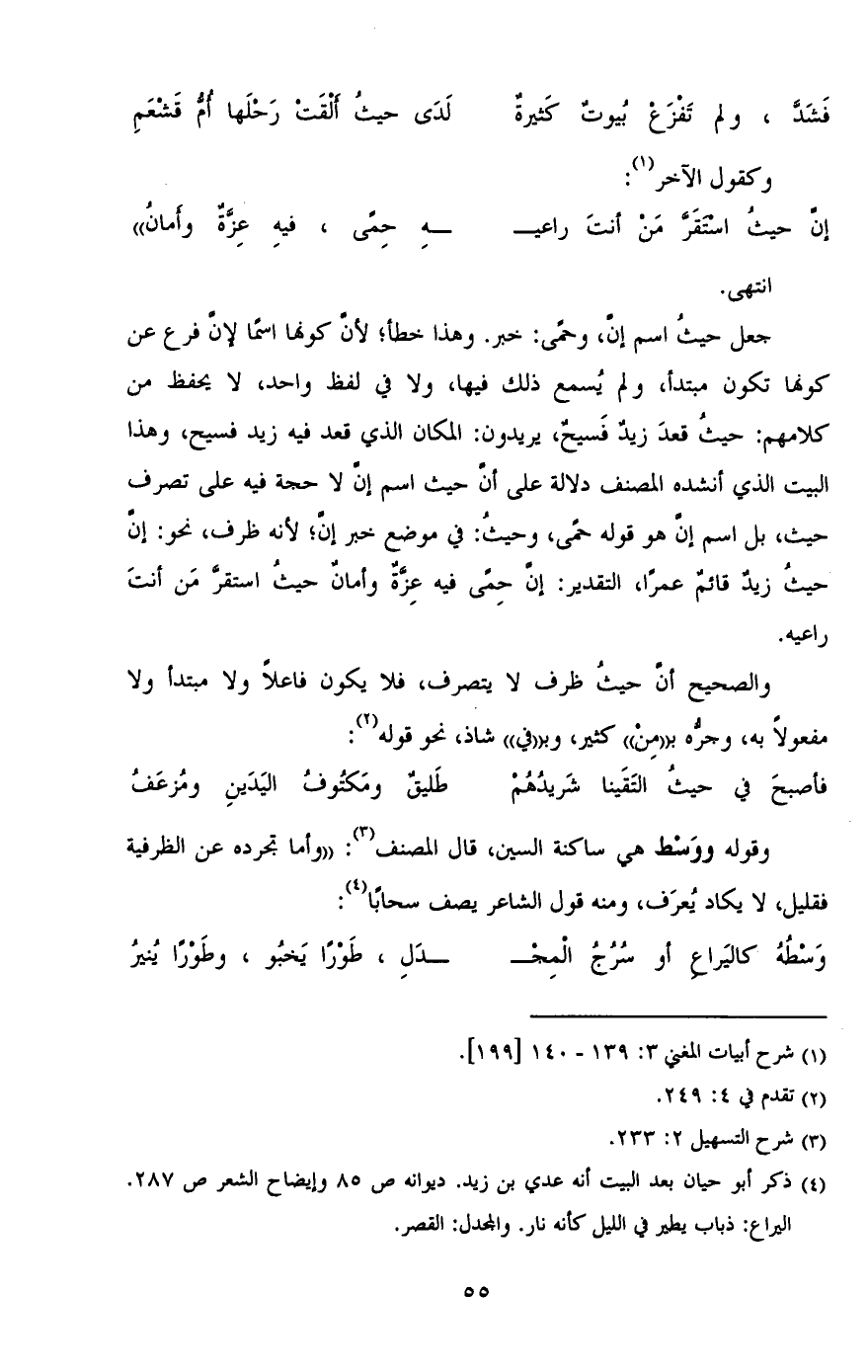 جعل حيث اسم إن، وحمى: خبر. وهذا خطأ؛ لأن كونها اسمًا لأن فرع عن كونها يكون مبتدأ، ولم يُسمع ذلك فيها، ولا في لفظ واحد، لا يحفظ من كلامهم: حيث قعد زيدٌ فسيحٌ، يريدون: المكان الذي قعد فيه زيد فسيحن وهذا البيت الذي أنشده المصنف دلالة على أن حيث اسم إن لا حجة فيه على تصرف حيث، بل اسم إن هو قوله حمى، وحيث: في موضع خبر إن؛ لأنه ظرف، نحو: إن حيث زيدٌ قائمٌ عمرًا، التقدير: إن حمى فيه عزةٌ وأمانٌ حيث استقر من أنت راعيه.
