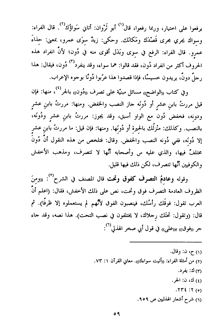 يرفعوا على اختيار، وربما رفعوا، قال أبو ثروان: أتاني سواؤك. قال الفراء: وسواك يجري مجرى قصدك ومكانك. وحكي: زيدٌ سوى عمرو، بمعنى: حذاء عمرو. قال الفراء: الرفع في سوى وبدل أقوى منه في دون؛ لأن انفراد هذه الحروف أكثر من انفراد دون، فقد قالوا: هما سواء وقد ينفرد دون، فيقال: هذا رجلٌ دونٌ، يريدون خسيسًا، فإذا قصدوا هذا غربوا دُونًا بوجوه الإعراب.