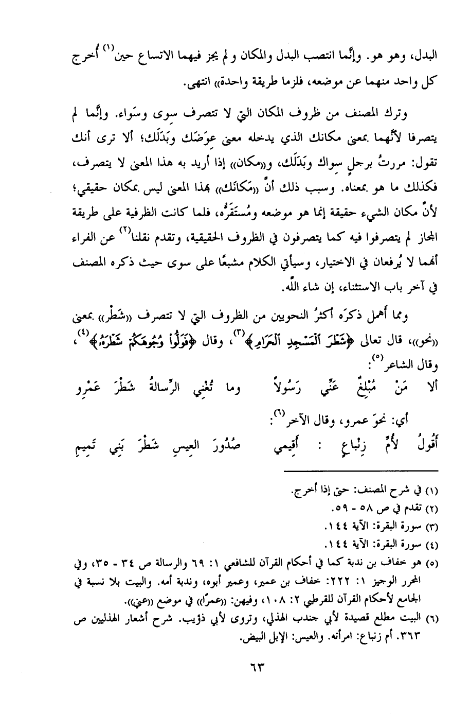 ومما أهما ذكره أكثر النحويين من الظروف التي لا تتصرف "شطر" بمعني"نحو" قال تعالي {شَطْرَ المَسْجِدِ الحَرَامِ}، وقال {فَوَلُّوا وجُوهَكُمْ شَطْرَهُ}، وقال الشاعر: