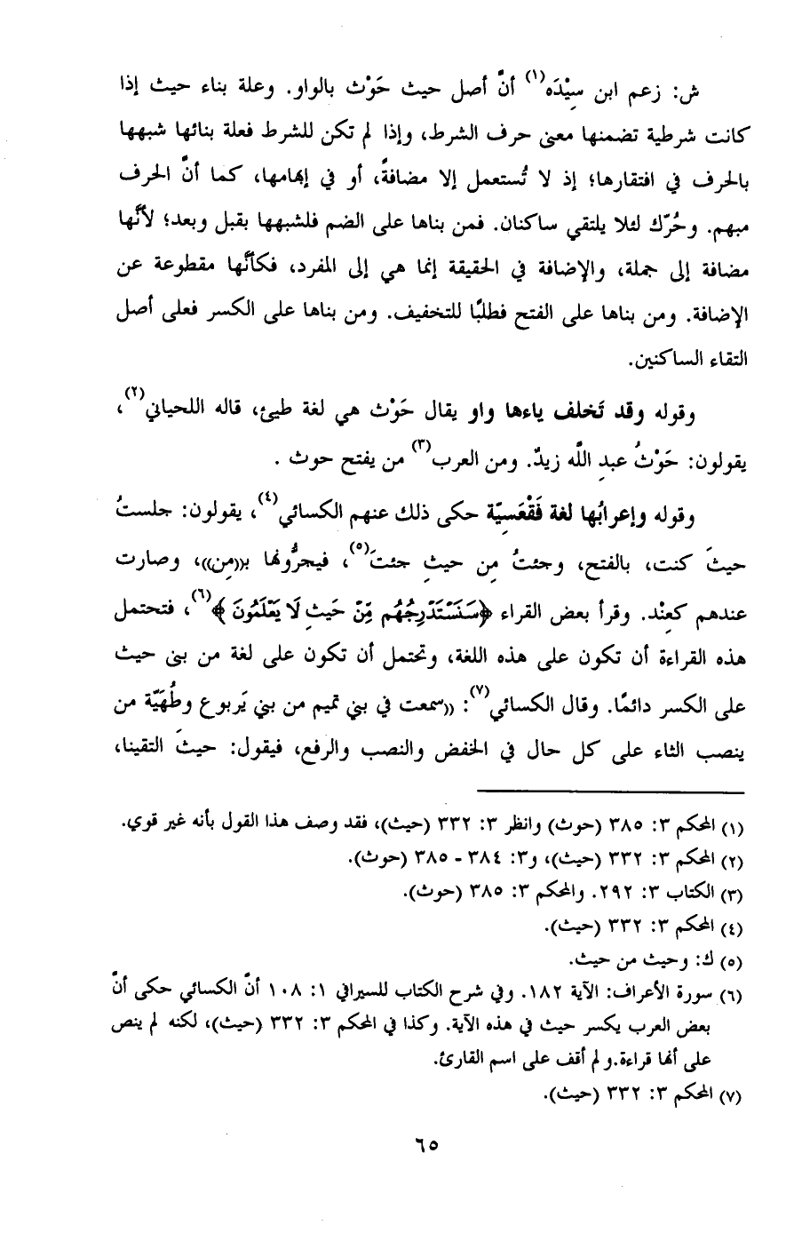 وقوله وإعرابها لغة فقعسية حكي ذلك عنهم الكسائي، يقولون: جلست حيث كنت، بالفتح، وجئت من حيث جئت، فيجرونها ب"من"، وصارت عندهم كعند. وأقرأ بعض القراء {سَنَسْتَدْرِجُهُم مِّنْ حَيْثُ لا يَعْلَمُونَ}، فتحتمل هذه القراءة أن تكون علي هذه اللغة، وتحتمل أن تكون علي لغة من بني حيث علي الكسر دائماً. وقال الكسائي: "سمعت في بني تميم من بني يربوع وطهيه من ينصب الثاء لي كل حال في الخفض والنصب والرفع، فيقول: حيث التقينا،