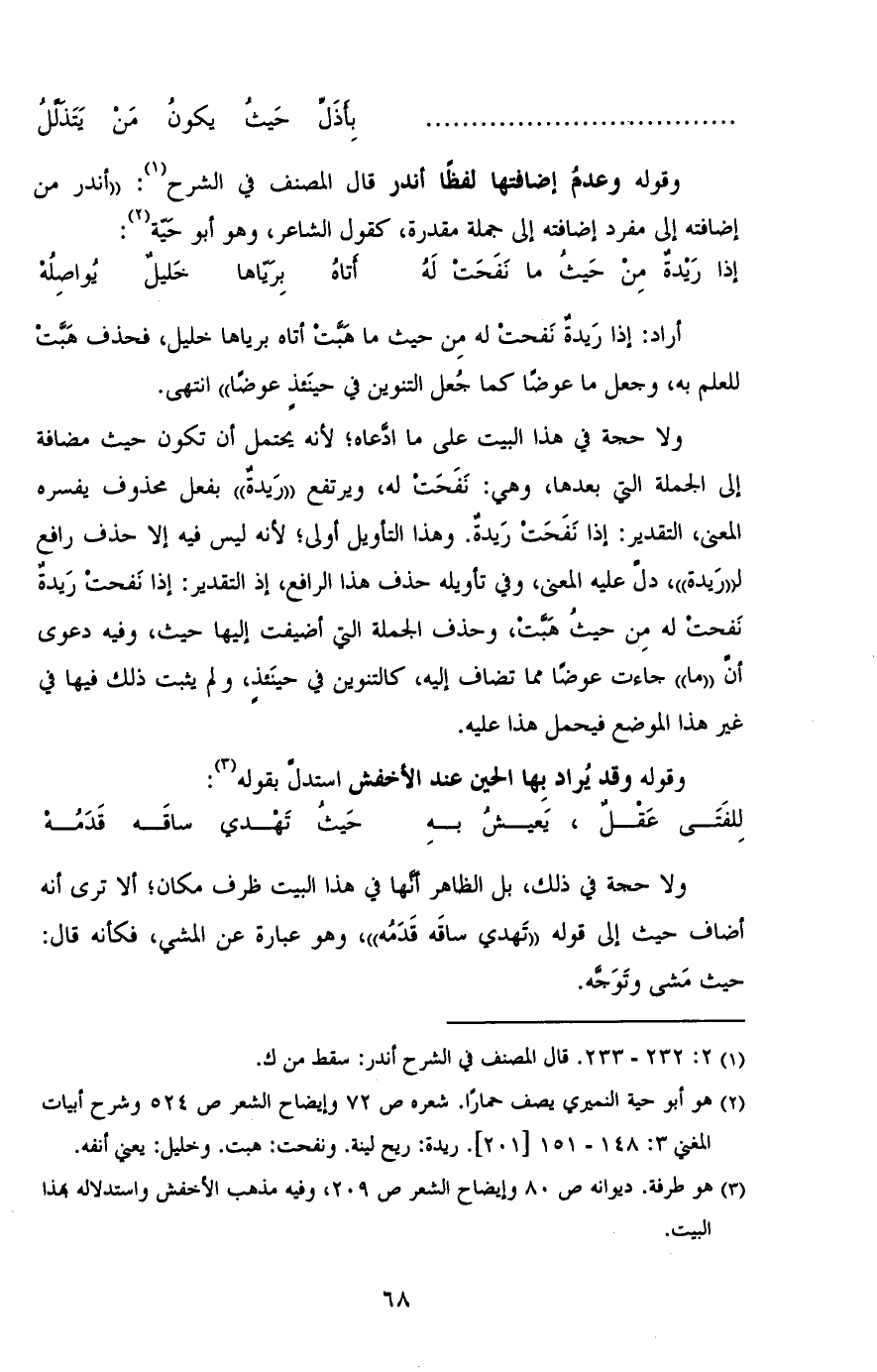 ولا حجة في هذا البيت علي ما ادعاه؛ لأنه يحتمل أن تكون حيث مضافة إلي الجملة التي بعدها، وهي: نفحت لهن ويرتفع "ريدة" بفعل محذوف يفسره المعني، التقدير: إذا نفحت ريدة. وهذا التأويل أولي؛ لأنه ليس فيه إلا حذف رفع ل"ريدة"، دل عليه المعني، وفي تأويله حذف هذا الرافع، إذ التقدير: إذا نفحت ريدة نفحت له من حيث هبت، وحذف الجملة التي أضفيت إليها حيث، وفيه دعوي أن "ما" جاءت عوضاً مما تضاف إليه، كالتنوين في حينئذ، ولم يثبت ذلك فيها في غير هذا الموضوع فيحمل هذا عليه.