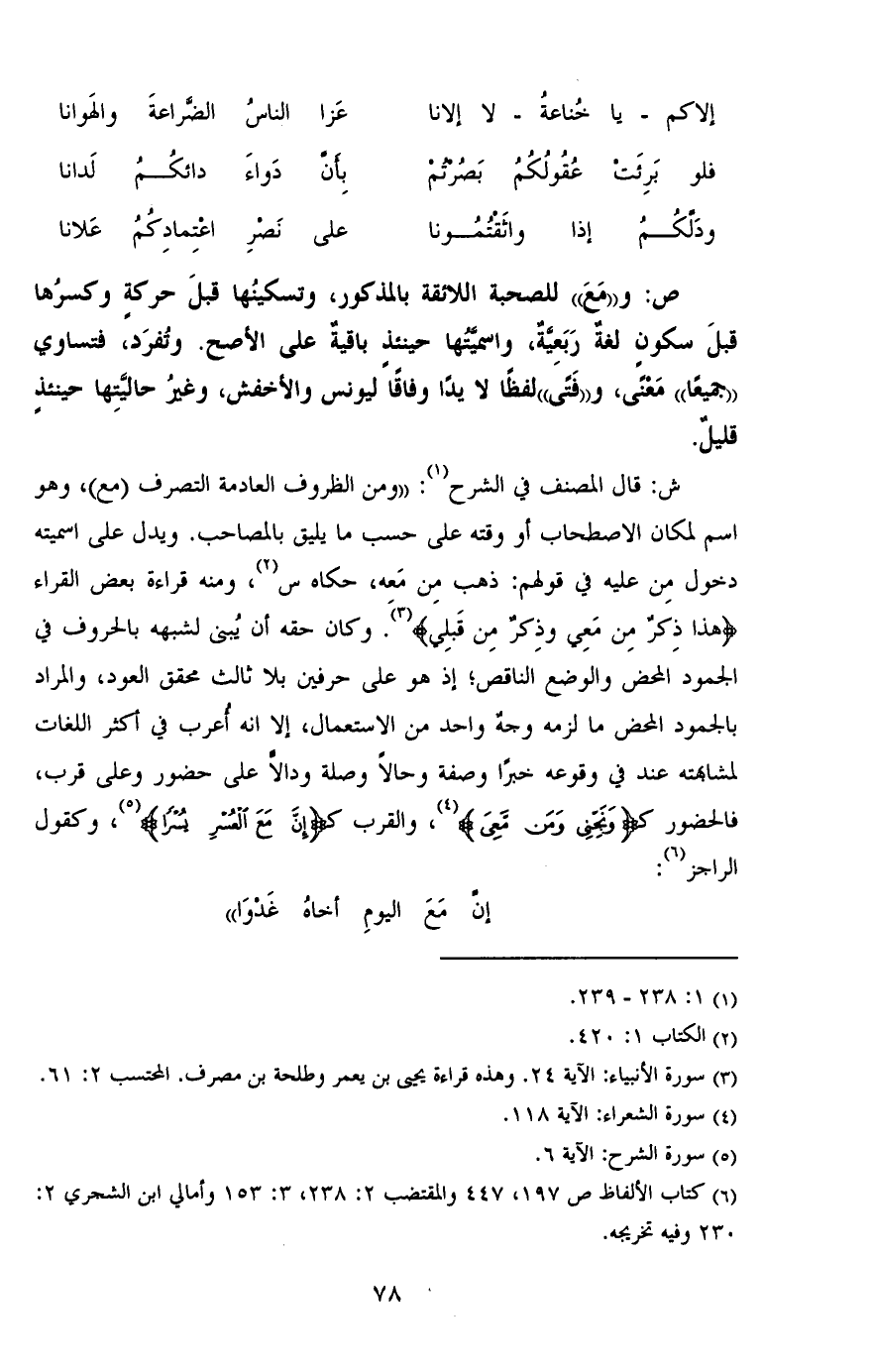 ش: قال المصنف في الشرح: "ومن الظروف العادمة التصرف (مع)، وهو اسم لمكان الاصطحاب أو وقته على حسب ما يليق بالمصاحب. ويدل على اسميته دخول من عليه في قولهم: ذهب من معه، حكاه س، ومنه قراءة بعض القراء {هَذَا ذِكْرُ مَن مَّعِيَ وذِكْرُ مَن قَبْلِي}. وكان حقه أن يبنى لشبهه بالحروف في الجمود المحض والوضع الناقص؛ إذ هو على حرفين بلا ثالث محقق العود، والمراد بالجمود المحض ما لزمه وجه واحد من الاستعمال، إلا أنه أعرب في أكثر اللغات لمشابهته عند في وقوعه خبرًا وصفة وحالًا وصلة ودالًا على حضور وعلى قرب، فالحضور كـ {ونَجِّنِي ومَن مَّعِيَ}، والقرب كـ {إنَّ مَعَ العُسْرِ يُسْرًا}، وكقول الراجز: