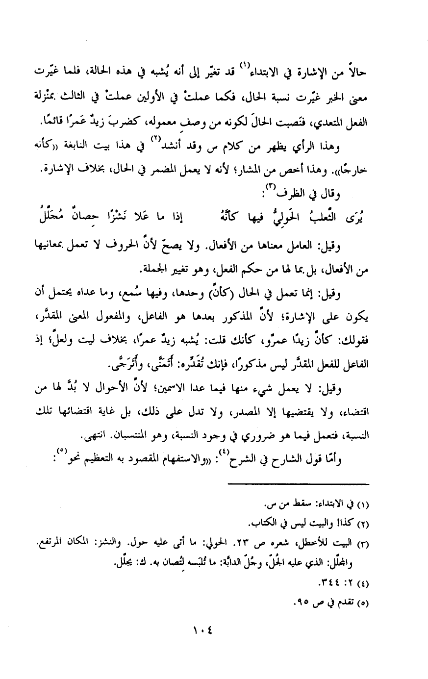 وقيل: لايعمل شئ منها فيما عدا الاسمين , لان الاحوال لابد لخا من اقضتاء , ولا يقتضيها إلا المصدر , ولا تدل على ذلك , بل غاية اقتضائها تلك النسبة , فتعمل فيما هو ضرورى فى وجود النسبة , وهو المنتسبان. انتهى