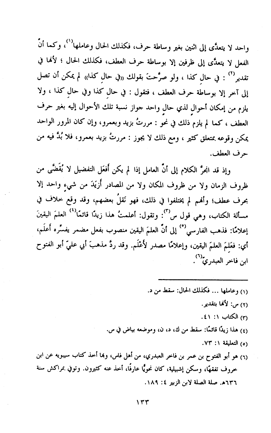 واحد لا يتعدى إلى اثنين بغير وساطة حرف فكذلك الحال وعاملها , وكما ان الفعل لا يتعدى إلى ظرفين إلا بواسطة حرف العطف , فكذلك الحال , لانها فى تقدير: فى حال كذا , ولو صرحخت العطف , فتقول: فى حال كذا وفى حال كذا , ولا يلزم من إمكان أحوال لذى حال واحد جواز نسبة تلك الاحوال إليه بغير حرف العطف , كما لم يلزم ذلك فى نحو: مررت بزيد وبعمرو , وإن كان المرور الواحد يمكن وقوعه بمتعلق كثير , ومع ذلك لا يجوز: مررت بزيد بعمرو, فلا بد فيه من حرف العطف.