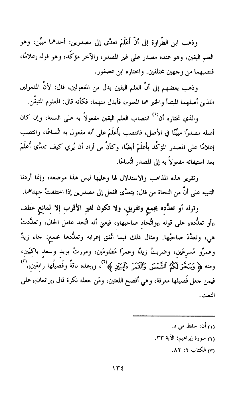 وذهب ابن الطرواة إلى ان أعلم تعدى ألى مصدرين: احدهما مبين. وهو العلم اليقين , وهو عنده مصدر على غير المصدر, والاخر مؤكد , وهو قوله إعلاما , فنصبهما من وجهين مختلفين واختاره ابن عصفور.
