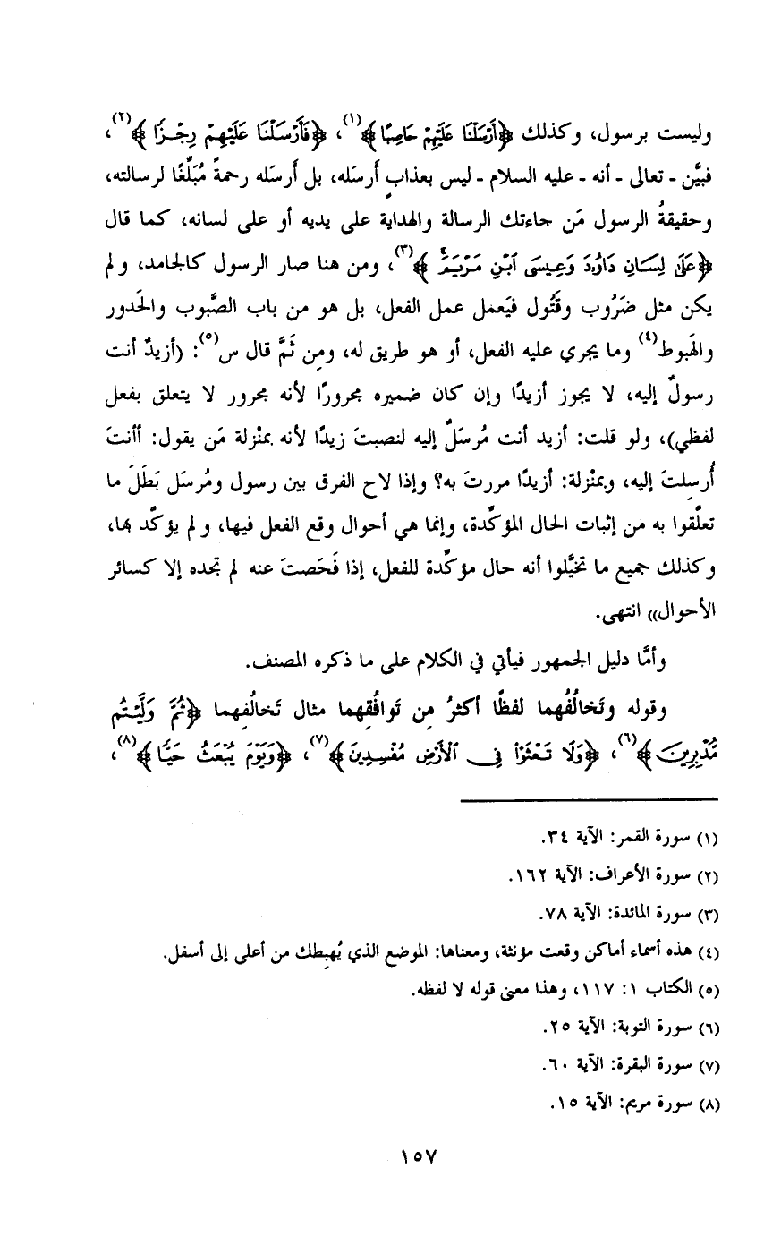 وليست برسول , وكذلك} أرسلنا عليهم حاصباً {,} فأرسلنا عليهم رجزاً {, فبين - تعالى - أنه - عليه السلام - ليس بعذاب أرسله , بل أرسله رحمه مبلغاً لرسالته , وحقيقة الرسول من جاءتك الرسالة والهداية على يديه أو على لسانه , كما قال} على لسان داود وعيسى ابن مريم {, ومن هنا صار الرسول كالجامد , ولم يكن مثل ضروب وقتول فيعمل عمل الفعل ,بل هو من باب الصبوب والحدور والهبوط وما يجري عليه الفعل , أو هو طريق له , ومن ثم قال س. (أريد أنت رسول إليه , لا يجوز أزيداً وان كان ضميره مجروراً لأنه مجرور لا يتعلق بفعل لفظي) , ولو قلت: أزيد أنت مرسل إليه لنصبت زيداً لأنه بمنزله من يقول: أأنت أرسلت إليه , وبمنزله: أزيداً مررت به؟ وإذا لاح الفرق بين رسول ومرسل بطل ما تعلقوا به من إثبات الحال المؤكدة , وإنما هي أحوال وقع الفعل فيها , ولم يؤكد بها , وكذلك جميع ما تخيلوا أنه حال مؤكده للفعل , إذا فحصت عنه لم تجده إلا كسائر الأحوال» انتهى.