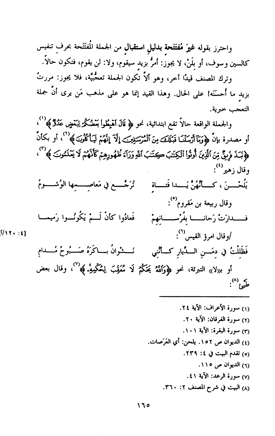 وترك المصنف قيداً آخر , وهو ألا تكون الجملة تعجبيه , فلا يجوز: مررت بزيد ما أحسنه! على الحال. وهذا القيد إنما هو على مذهب من يرى أن جمله التعجب خبريه.