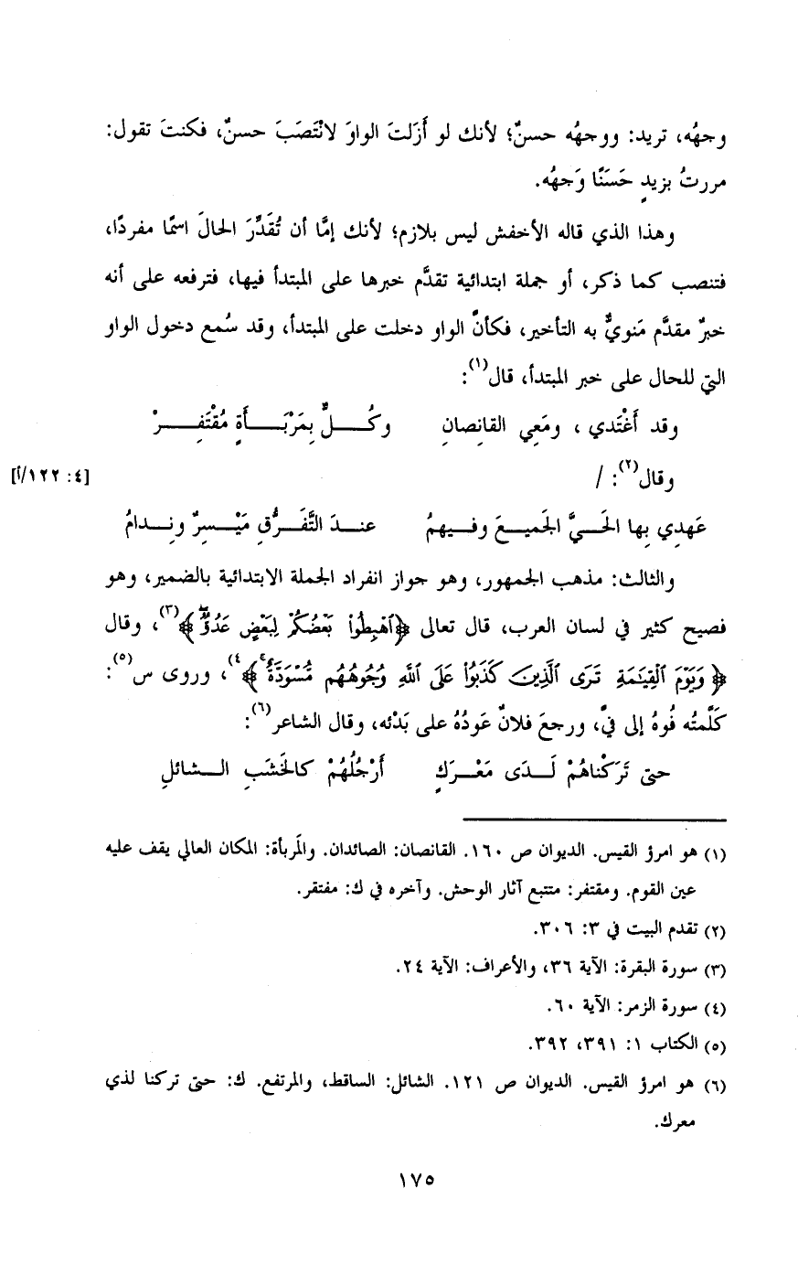 وهذا الذي قاله الأخفش ليس بلازم , لأنك إما أن تقدر الحال اسماً مفرداً , فتنصب كما ذكر , أو جمله ابتدائية تقدم خبرها على المبتدأ فيها , فترفعه على أنه خبر مقدم منوي به التأخير , فكأن الواو دخلت على المبتدأ , وقد سمع دخول الواو التي للحال على خبر المبتدأ , قال: