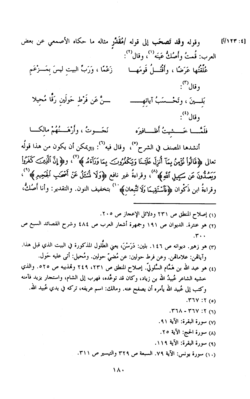 أنشدها المصنف في الشرح , وقال فيه: «ويمكن أن يكون من هذا قوله تعالى} قالوا نؤمن بما أنزل علينا ويكفرون بما وراءه {, و} إن الذين كفروا ويصدون عن سبيل الله {, وقراءه غير نافع} ولا تسئل عن أصحاب الجحيم {, وقراءه ابن ذكوان} فاستقيما ولا تتبعان {بتخفيف النون. والتقدير: وأنا أصك ,