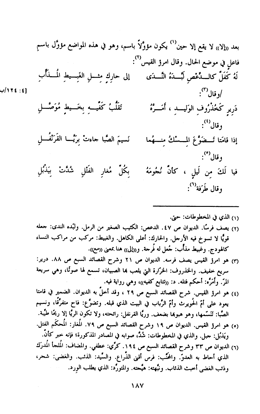بعد «إلا» لا يقع إلا حين يكون مؤولاً باسم، وهو في هذه المواضع مؤول باسم فاعل في موضع الحال. وقال امرؤ القيس: