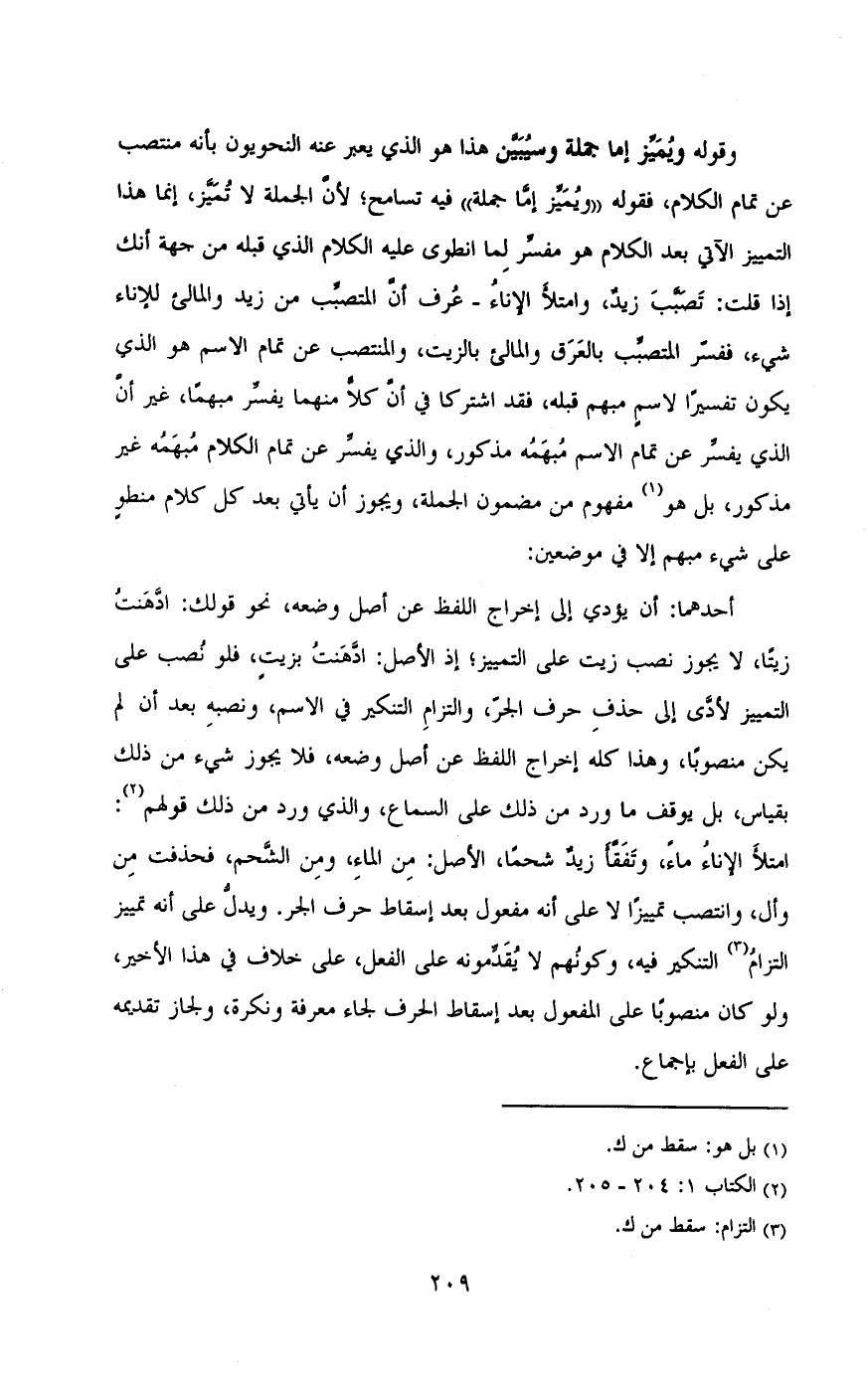 امتلأ الاناء ماء , ونفق ذيد شحما , الاصل: من الماء , ومن الشحم , فحذفت من وأل , وانتصب تمييزا لا علي انه مفعول بعد اسقاط حرف الجر. ويدل علي انه تمييز التزام التنكير فيه , وكونهم لايقدمونه علي الفعل , علي خلاف في هذا الاخير ,ولو كان منصوبا علي المفعول بعد اسقاط الحرف لجاء معرفه ونكره , ولجاز تقديمه علي الفعل بإجماع.