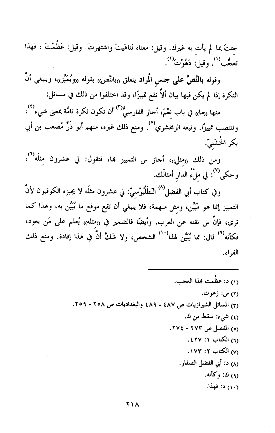 وفي كتاب أبي الفضل البطليوسي: لي عشرون مثله لا يجيزه الكوفيون لأن التمييز إنما هو مبين، ومثل مبهمة، فلا ينبغي أن تقع موقع ما يبين به، وهكذا كما ترى، فإن س نقله عن العرب. وأيضا فالضمير في «مثله» يعلم على من يعود، فكأنه قال: مما يبين لهذا الشخص، ولا شك أن في هذا إفادة. ومنع ذلك الفراء.