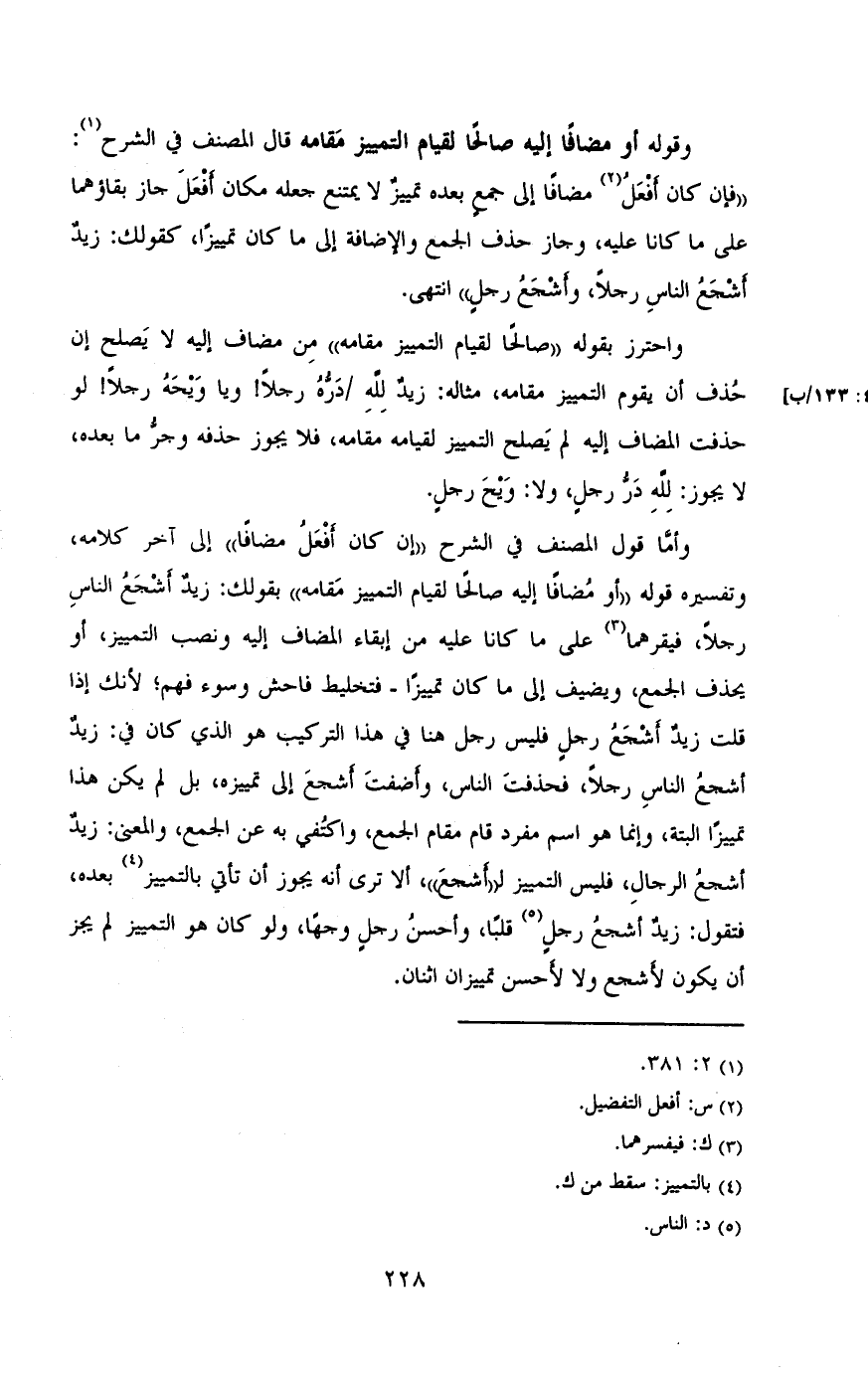 وأما قول المصنف في الشرح «إن كان أفعل مضافا» إلي آخر كلامه، وتفسيره قوله «أو مضافا إليه صالحا لقيام التمييز مقامه» بقولك: زيد أشجع الناس رجلا، فيقرهما على ما كان عليه من إبقاء المضاف إليه ونصب التمييز، أو يحذف الجمع، ويضيف إلي ما كان تمييزا - فتخليط فاحش وسؤ فهم؛ لأنك إذا قلت زيد أشجع رجل فليس رجل هنا في هذا التركيب هو الذي كان في: زيد أشجع الناس رجلا، فحذفت الناس، وأضفت أشجع إلي تمييزه، بل لم يكن هذا تمييزا البتة، وإنما هو اسم مفرد قام مقام الجمع، والمعنى: زيد أشجع الرجال، فليس التمييز ل «أشجع»، ألا ترى أنه يجوز أن تأتي بالتمييز بعده، فتقول: زيد أشجع رجل قلبا، وأحسم رجل وجها، ولو كان هو التمييز لم يجز أن يكون لأشجع ولا لأحسن تمييزان اثنان.