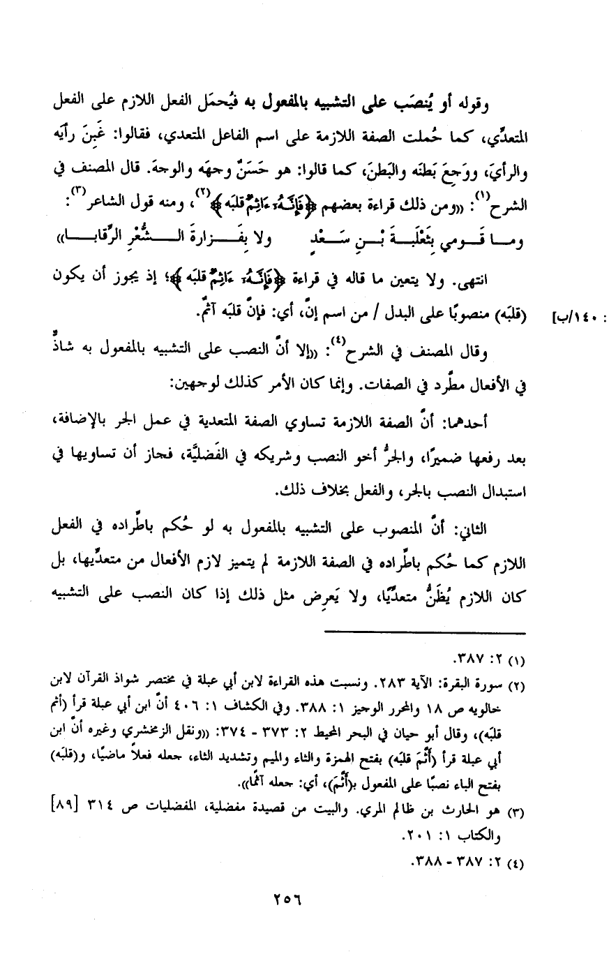 وقوله أو ينصب علي التشبيه بالمفعول به فيحمل الفعل اللازم علي الفعل المتعدي، كما حملت الصفة اللازمة علي اسم الفاعل المتعدي، فقالوا: غبن رأيه والرأي، ووجع بطنه والبطن، كما قالو: هو حسن وجهه والوجه. قال المصنف في الشرح: «ومن ذلك قراءة بعضهم {فإنه ءاثم قلبه}، ومنه قول الشاعر: