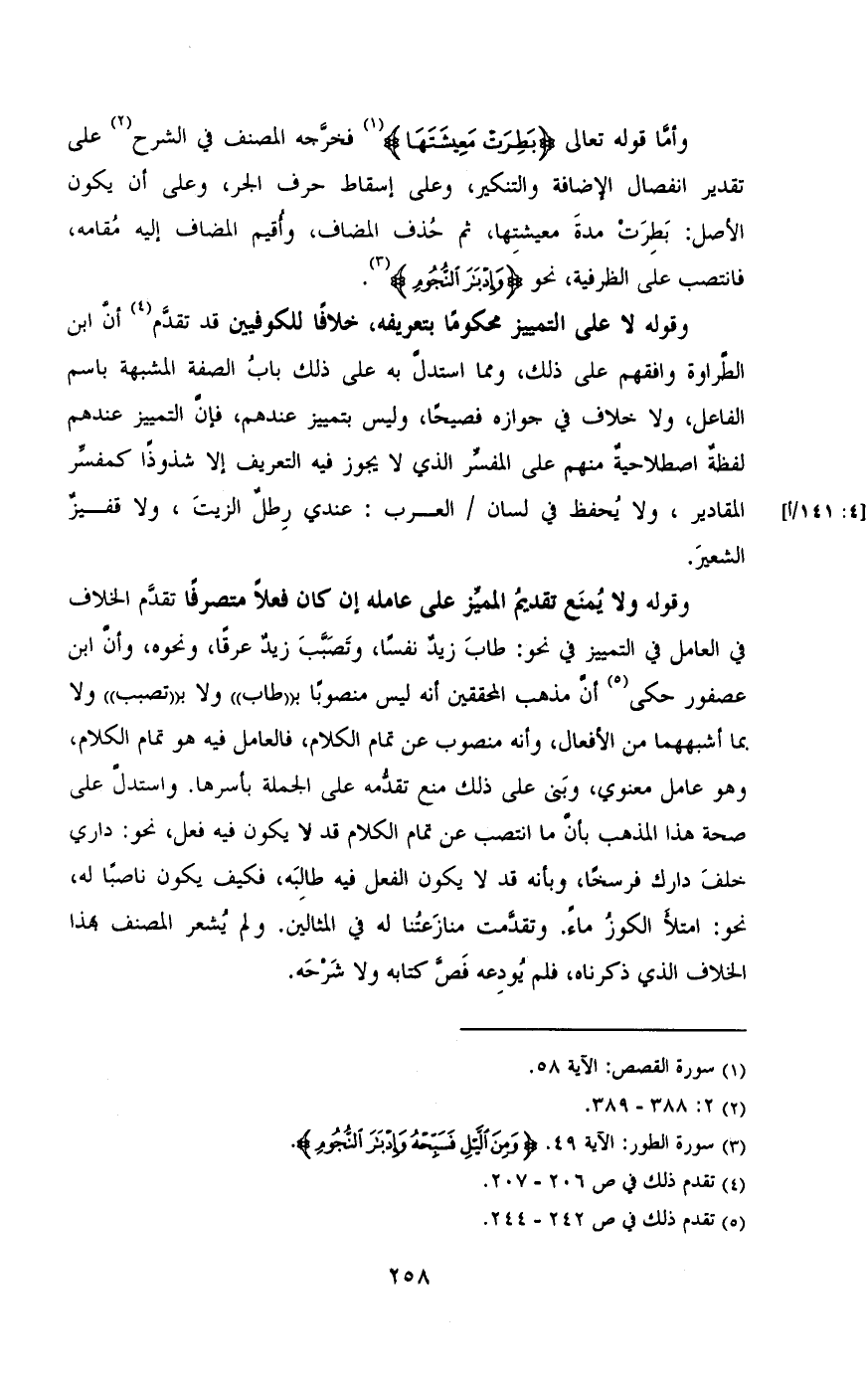 وأما قوله تعالى {بطرت معيشتها} فخرجه المصنف في الشرح علي تقدير انفصال الإضافة والتنكير، وعلي اسقاط حرف الجر، وعلي أن يكون الأصل: بطرت مده معيشتها، ثم حذف المضاف، وأقيم المضاف إليه مقامه، فانتصب علي الظرفية، نحو {وإدبار النجوم}.