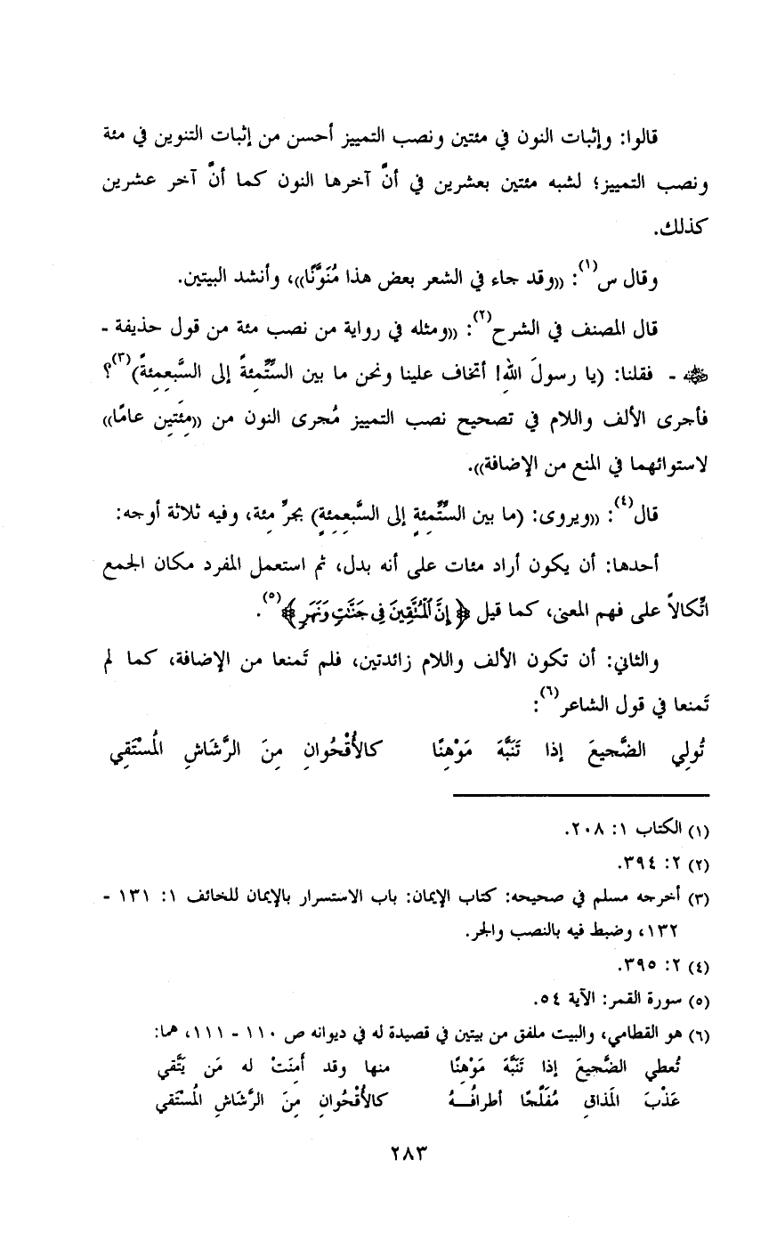 قالو: وإثبات النون فى مئين ونصب التمييز أحسن من اثبات التنوين فى مئة