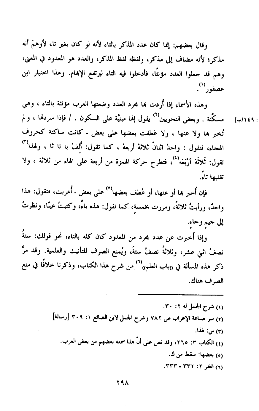 وقال بعضهم: انما كان عدد المذكر بالتاء لانة كان بغير تاء لأوهم أنة مذكر، لانة مضاف الى مذكر، ولفظة لفظ المذكر، والعدد هو المعدود فى المعنى، وهم قد جعلوا العدد مؤنثا، فأدخلوا فية التاء ليرتفع الابهام. وهذا اختبار ابن عصفور.