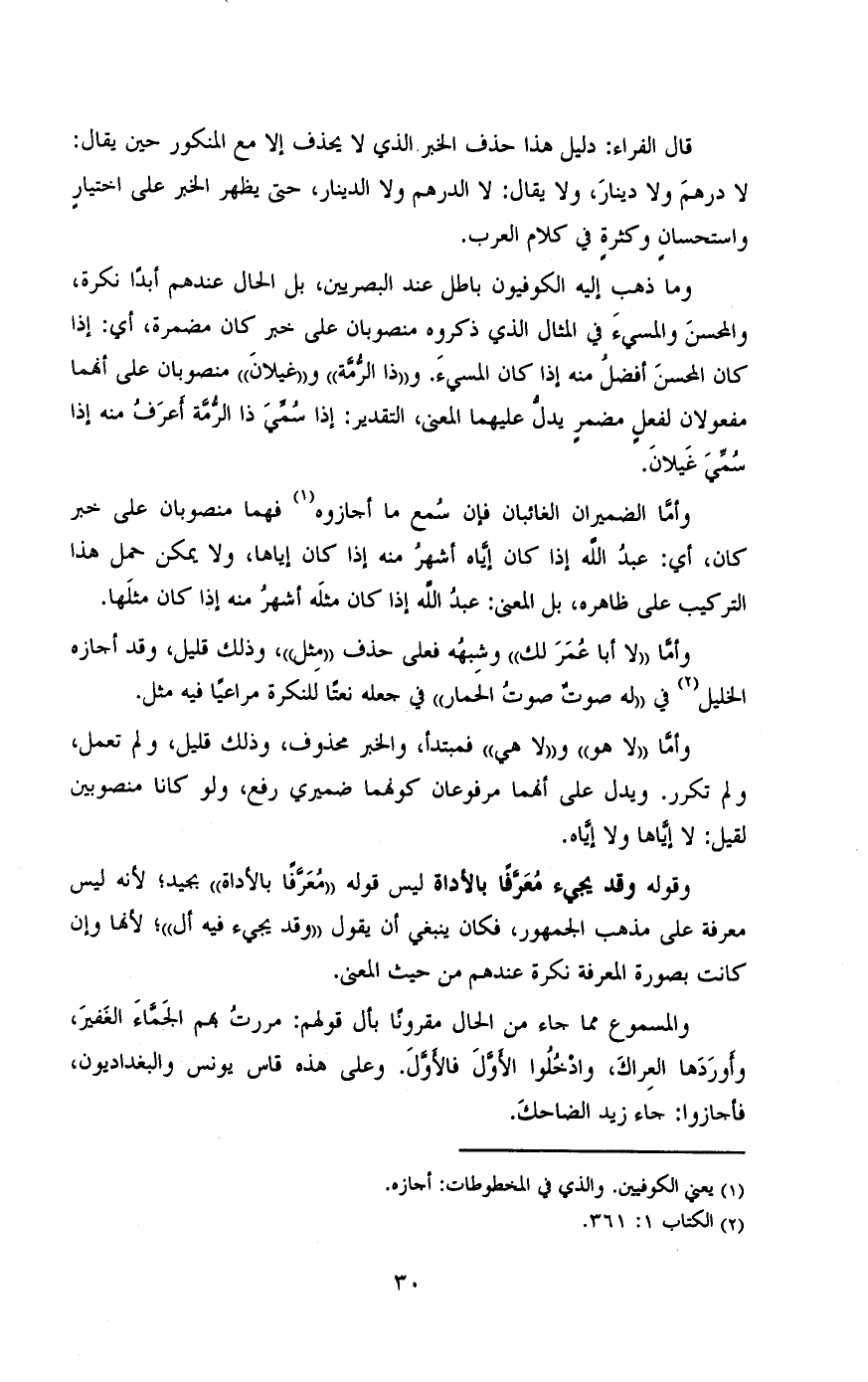 وما ذهب إليه الكوفيون باطل عند البصريين , بل الحال عندهم أبداً بكره , والمحسن والمسيء في المثال الذي ذكروه منصوبان على خبر كان مضمره , أي: إذا كان المحسن أفضل منه إذا كان المسيء. و «ذا الرمة» و «غيلان» منصوبان على أنهما مفعولان لفعل مضمر يدل عليهما المعنى , التقدير: إذا سمى ذا الرمة أعرف منه إذا سُمى غيلان.