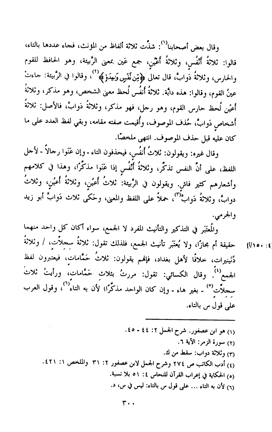 والمعتبر فى التذكير والتأنيث المفرد لا الجمع، سواء أكان كل واحد منهما حقيقة ام مجازا، ولا يعتبر تانيث الجمع، فلذلك تقول: ثلاثة سجلات، / وثلاثة دنينيرات، فخلافا لاهل بغداد، فانهم يقولون: ثلاث حمامات، فيعتبرون لفظ الجمع. وقال الكسائى: تقلو: مررت بثلاث حمامات، ورايت ثلاث سجلات ـ بغير هاء ـ وان كان الواحد مذكرا، لان به التاء، وقول العرب على قول س بالتاء.