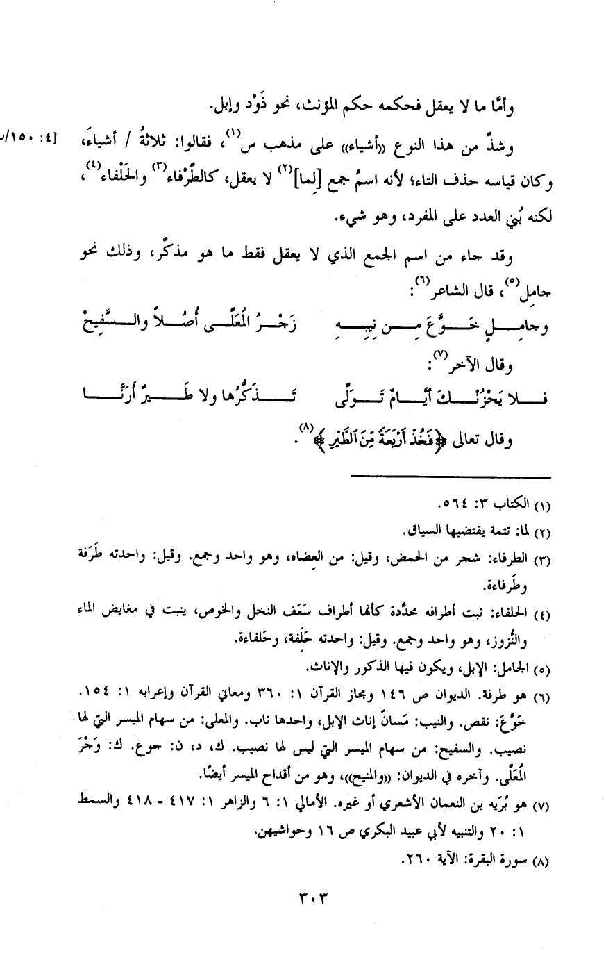 وشد من هذا النوع «اشياء» على مذهب س، فقالو: ثلاثة / أشياء، وكان قياسة حذف التاء، لأنة اسم جمع (لما) لايعقل، كالطرفاء والحلفاء، لكنة بنى العدد على المفرد، وهو شئ.