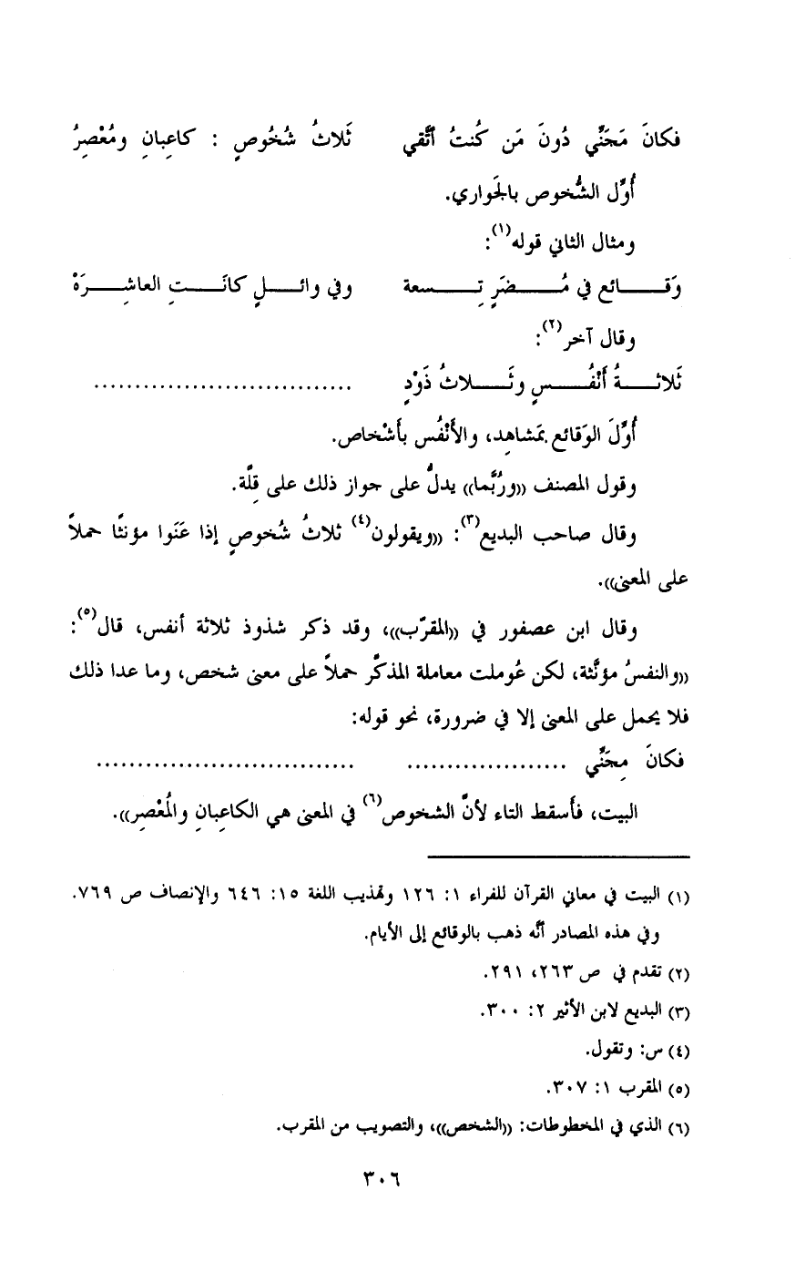 وقال صحاب البديع: «ويقولون ثلاث شخوص اذا عنوا مؤنثا حملا على المعنى».