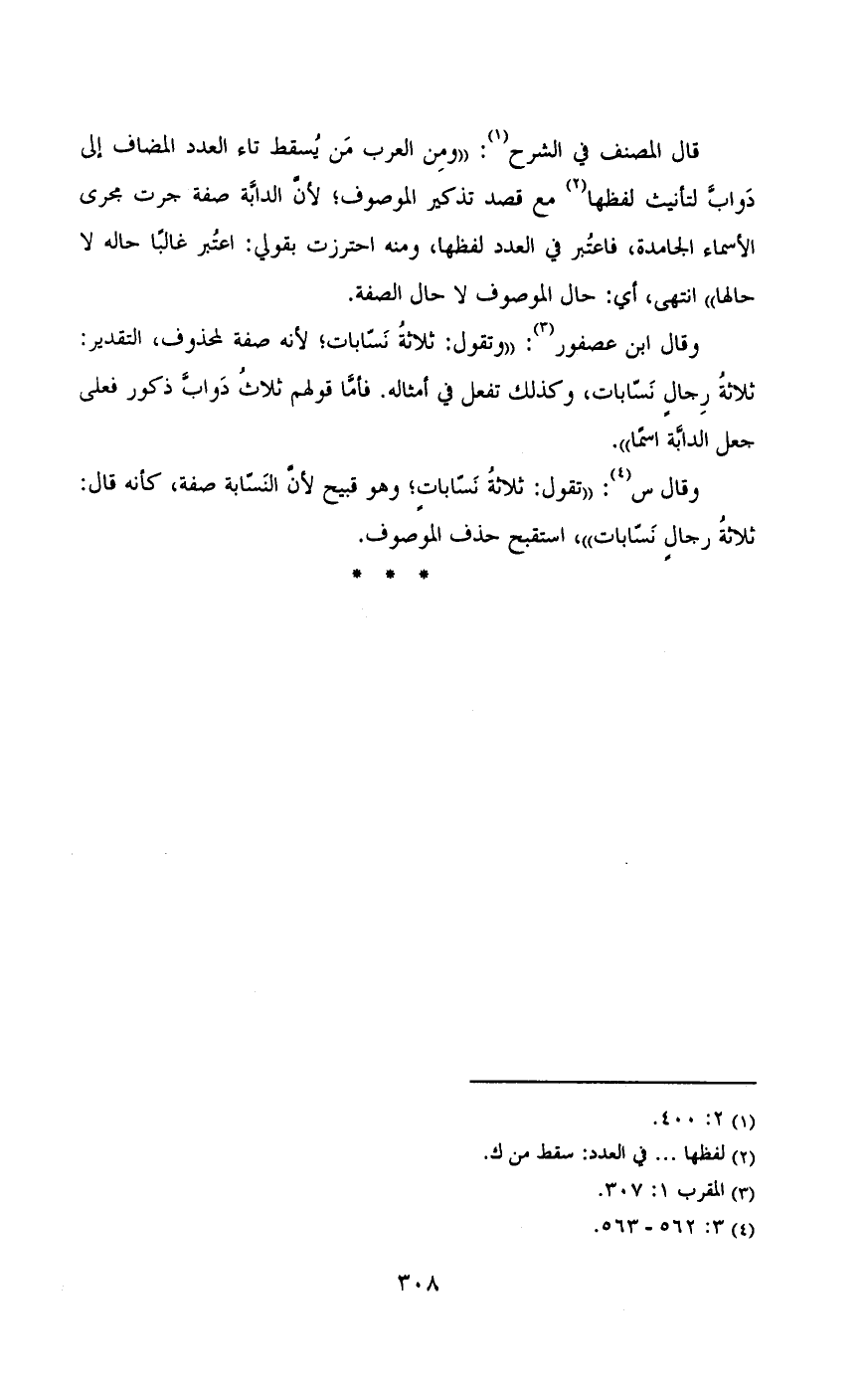 وقال س: «تقول: ثلاثة نسابات؛ وهو قبيح لان النسابة صفة، كأنة قال: ثلاثة رجال نسابات»، استقبح حذف الموصوف.