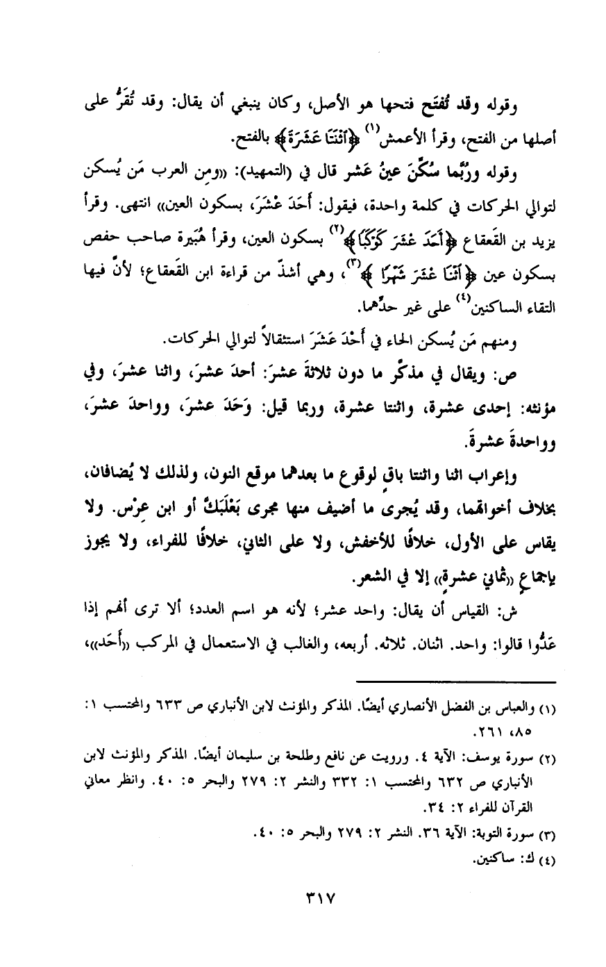 لتوالى الحركات في كلمه واحده، فيقول: أحد عشر، بسكون العين» انتهى. وقرأ