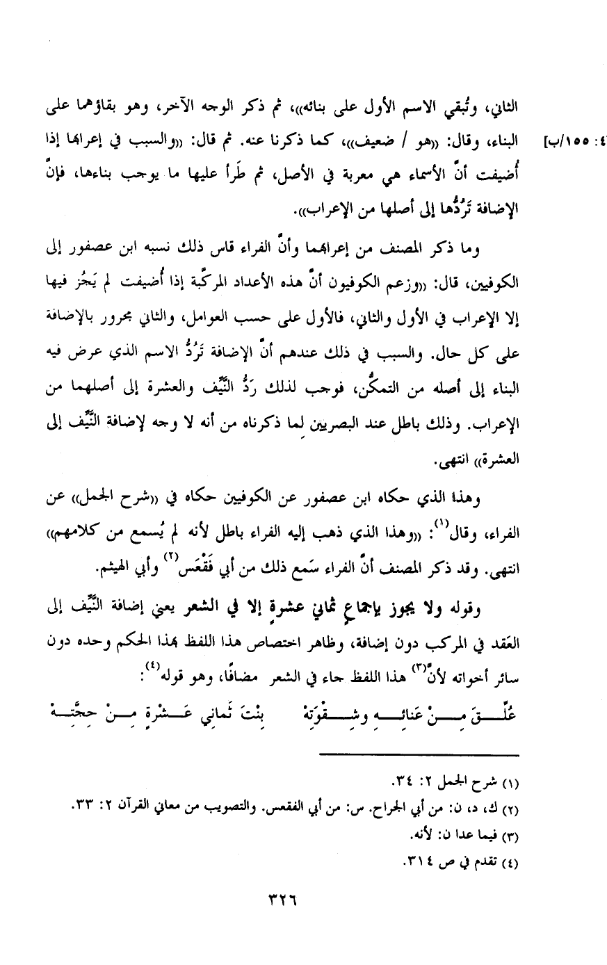 الكوفيين، قال «وزعم الكوفيون أن هذه الأعداد المركبة إذا أضيفت لم يجز فيها