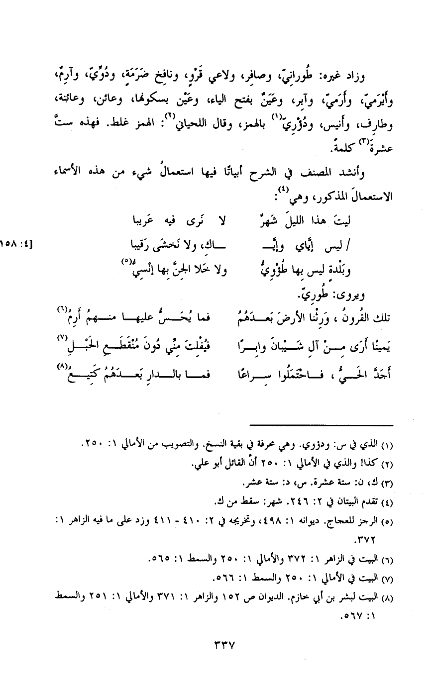 وزاد غيره: طوراني , وصافر , ولاعي فرو , ونافخ ضرمه , وارم , وايرمي , وارمي , وابر, وعين بفتح الياء , وعين بسكونها , وعائن , وعائنة , وطارف , وأنيس , ودؤري , بالهمزة , وقال الليحاني: الهمزة غلط فهذه ست عشره كلمة.