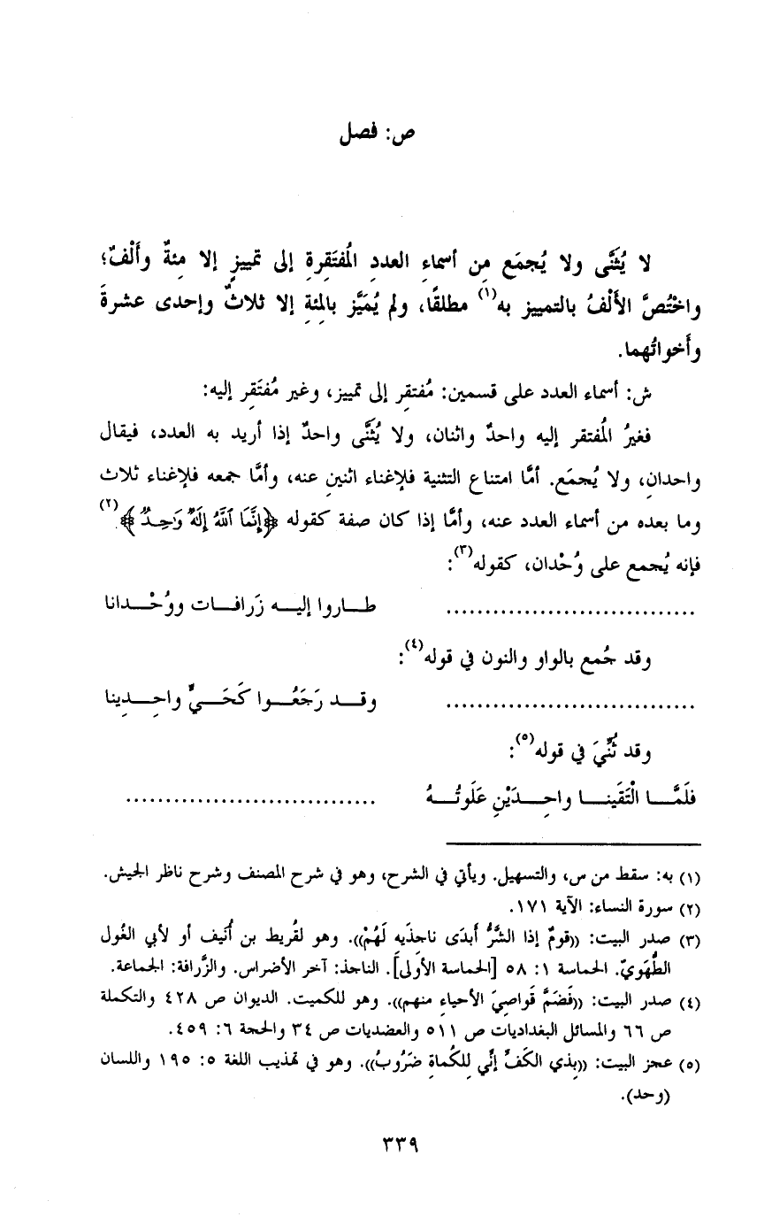 ولا يثني ولا يجمع من أسماء العدد المفتقرة إلي التمييز إلا مئة وألف ,واختص الألف بالتمييز به مطلقا , ولم يميز بالمئة إلا ثلاث واحدي عشرة وأخواتهما.]-